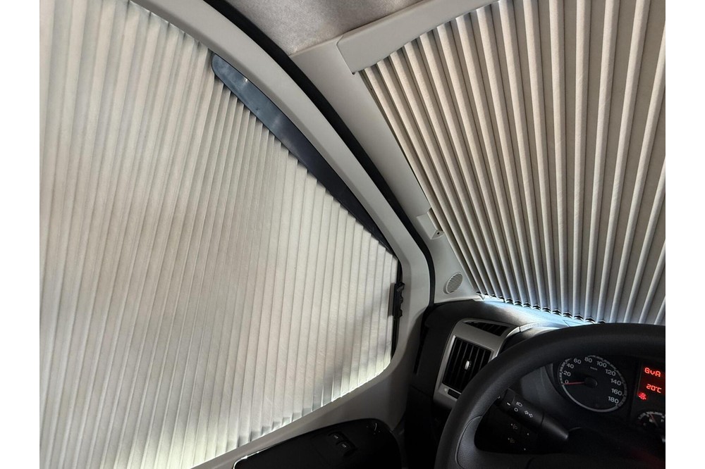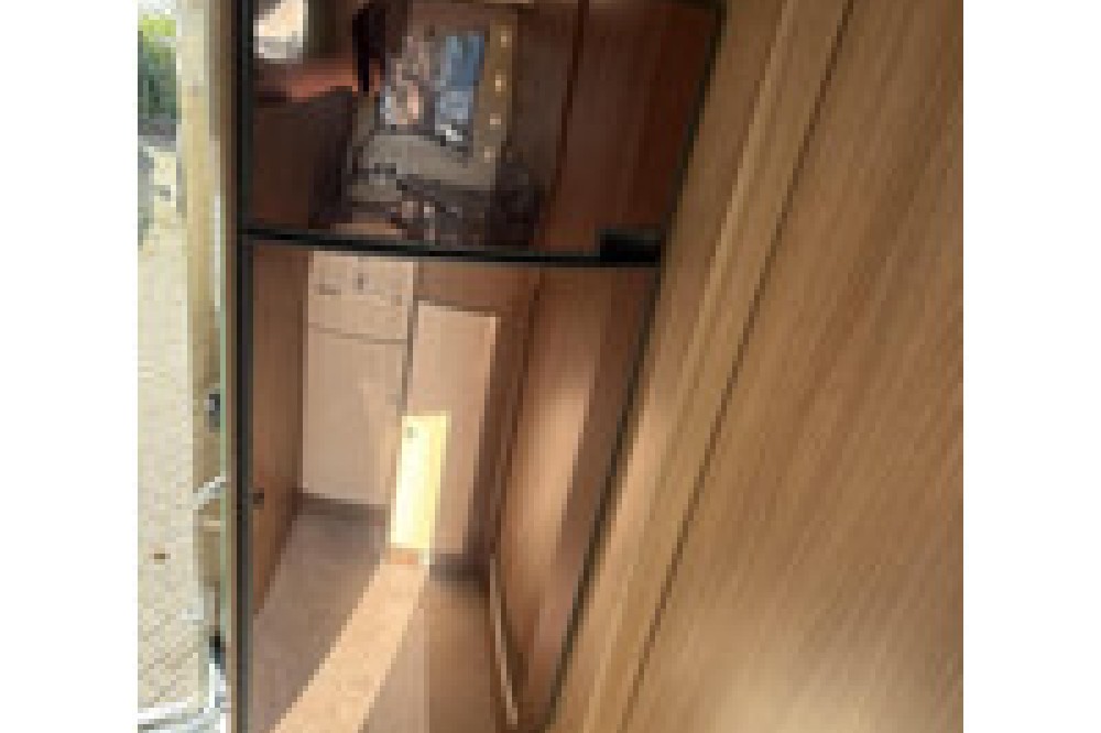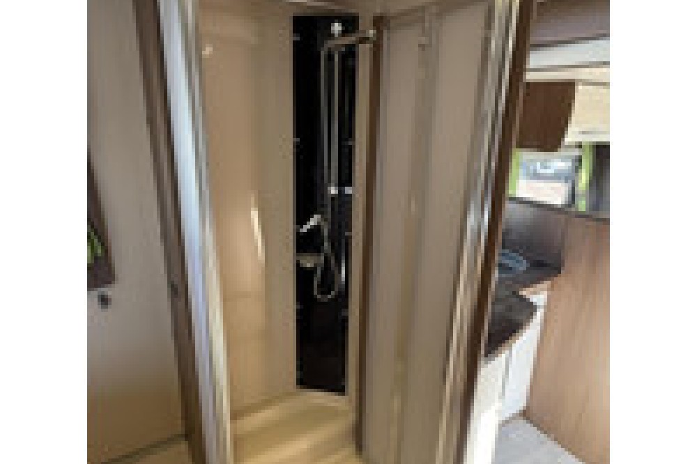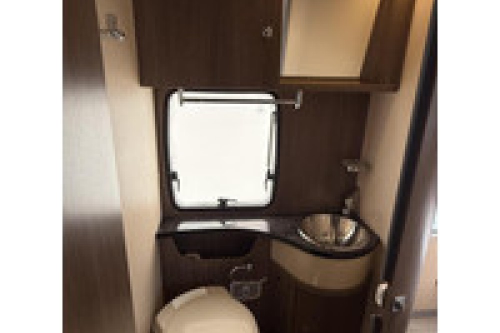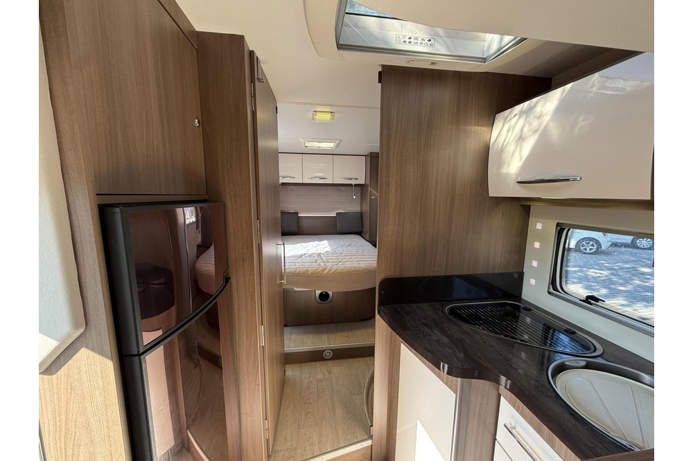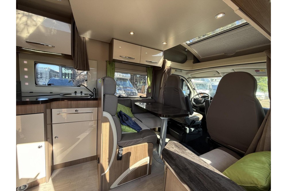 Deze camper heeft voorin de cabine, twee luxe volledig draai- en verstelbare comfortstoelen. Door de stoelen te draaien naar de dinette met zijbankje biedt deze camper een zeer ruime en gezellige zitgroep. Boven de zitgroep is een groot hefbed ideaal voor kinderen. Achter de zitgroep is een royale L-keuken welk is uitgerust met veel kastruimte en lades, een grote koelkast en vriesvak, een spoelbasin met mengkraan (warm en koud water) en een 3 pits gas-/kookcomfort. De toiletruimte met een Thetfort cassettetoilet, separte douchecabine. Achterin het Queensbed, het slaapgedeelte kunt u ook helemaal afsluiten voor een heerlijke nachtrust, daaronder een ruime garage. Een van de meest luxueuze campers op de markt