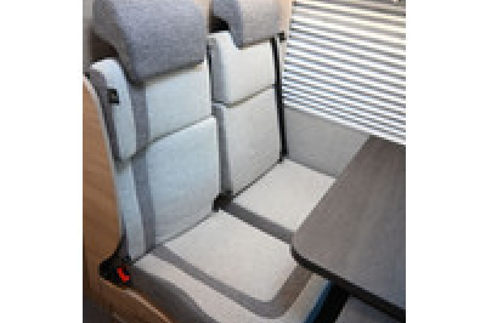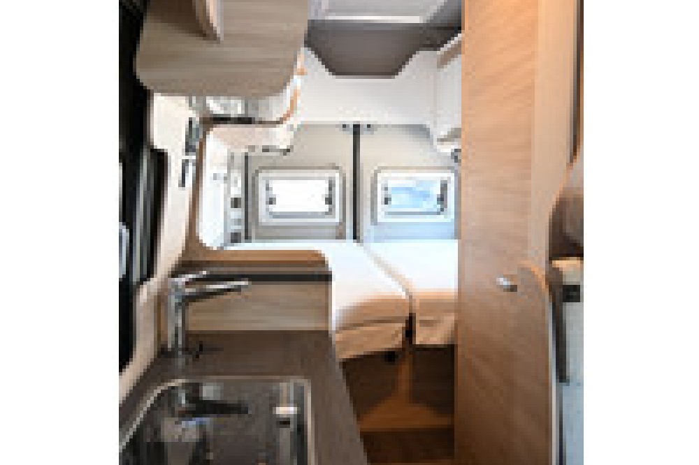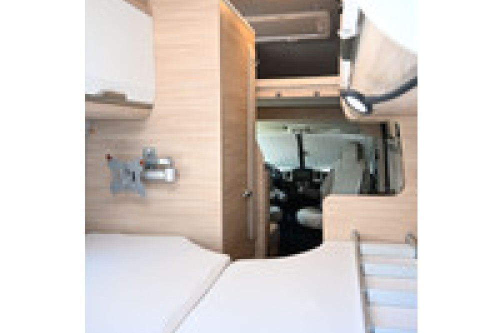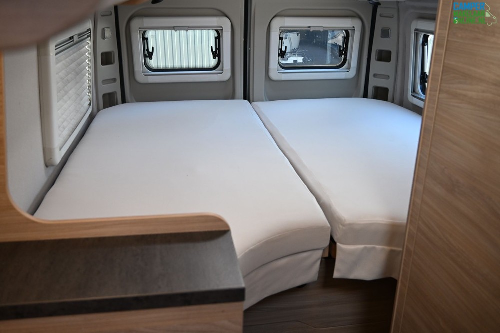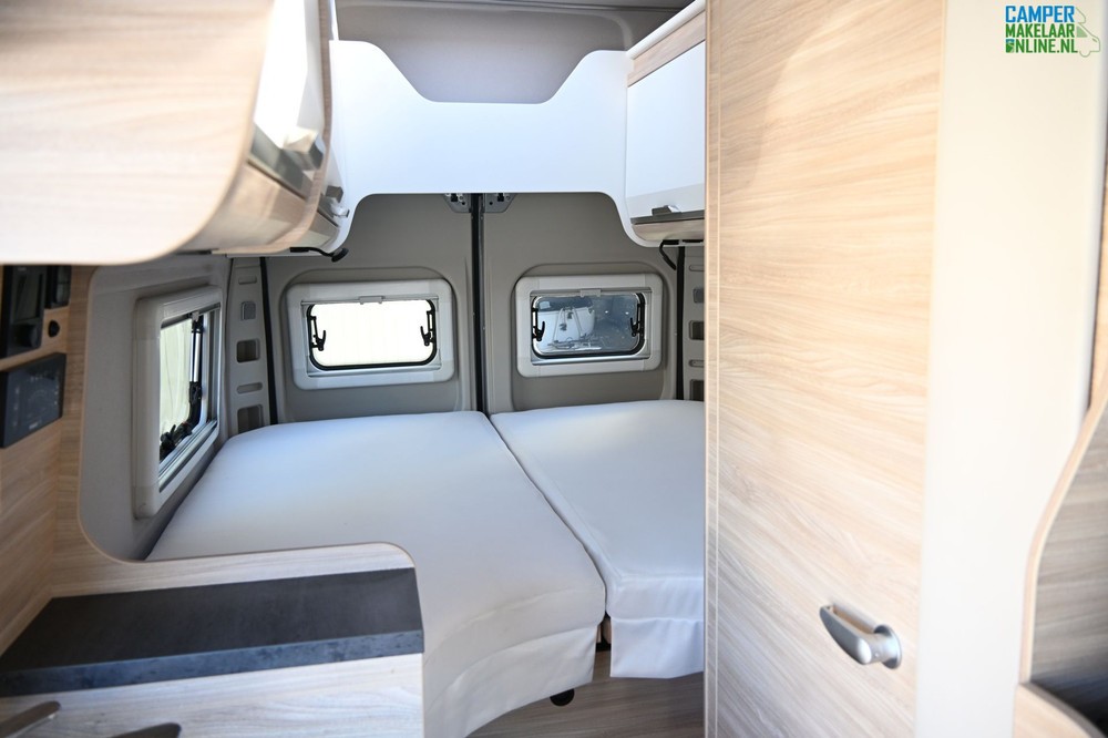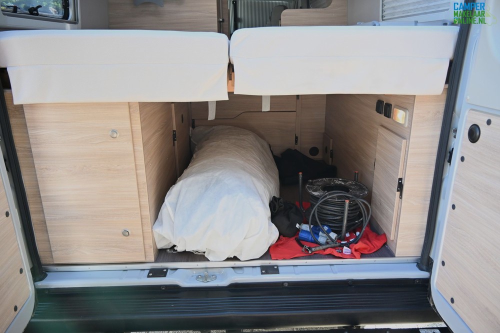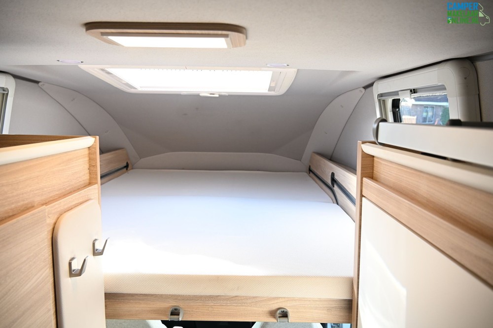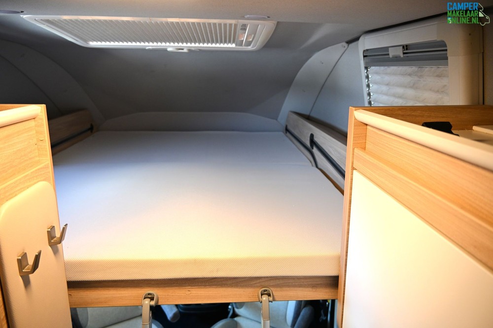 Dankzij de hoogte kon ook een vast(hef)bed voorzien worden voorin, je kan dus met z'n vieren slapen zonder de zitgroep om te bouwen, ondanks de beperkte lengte van zes meter. De Lifetime XL biedt ook achterin twee langsbedden, naast de twee slaapplaatsen in de lengte van het hefbed. Een vrij uniek aanbod onder de buscampers!