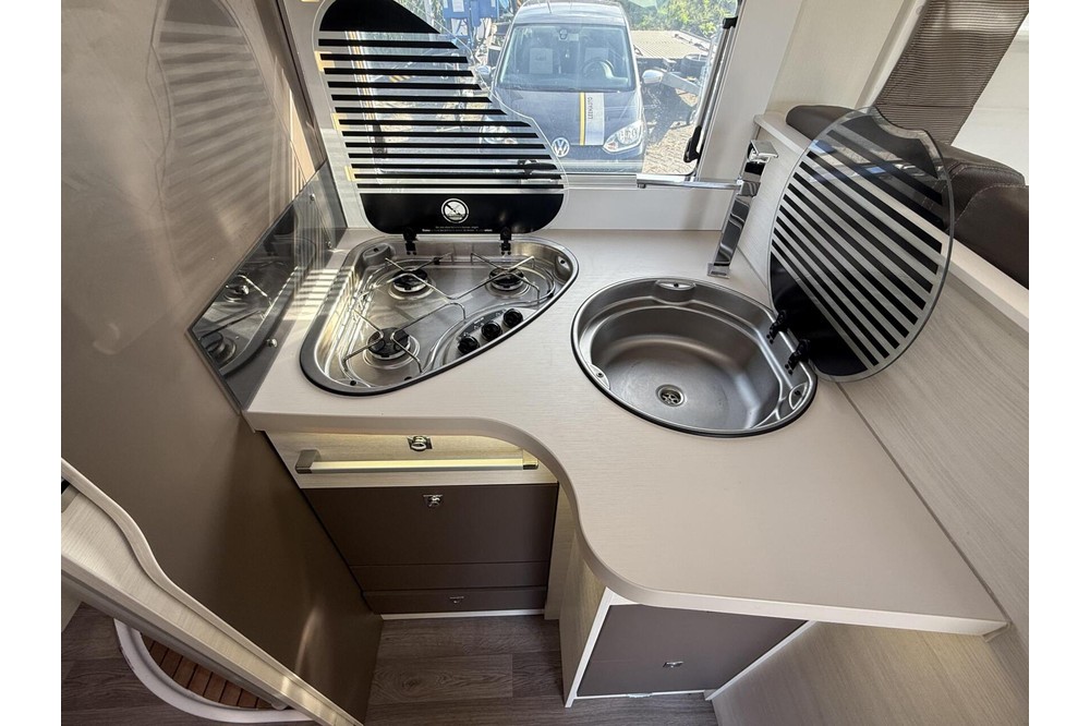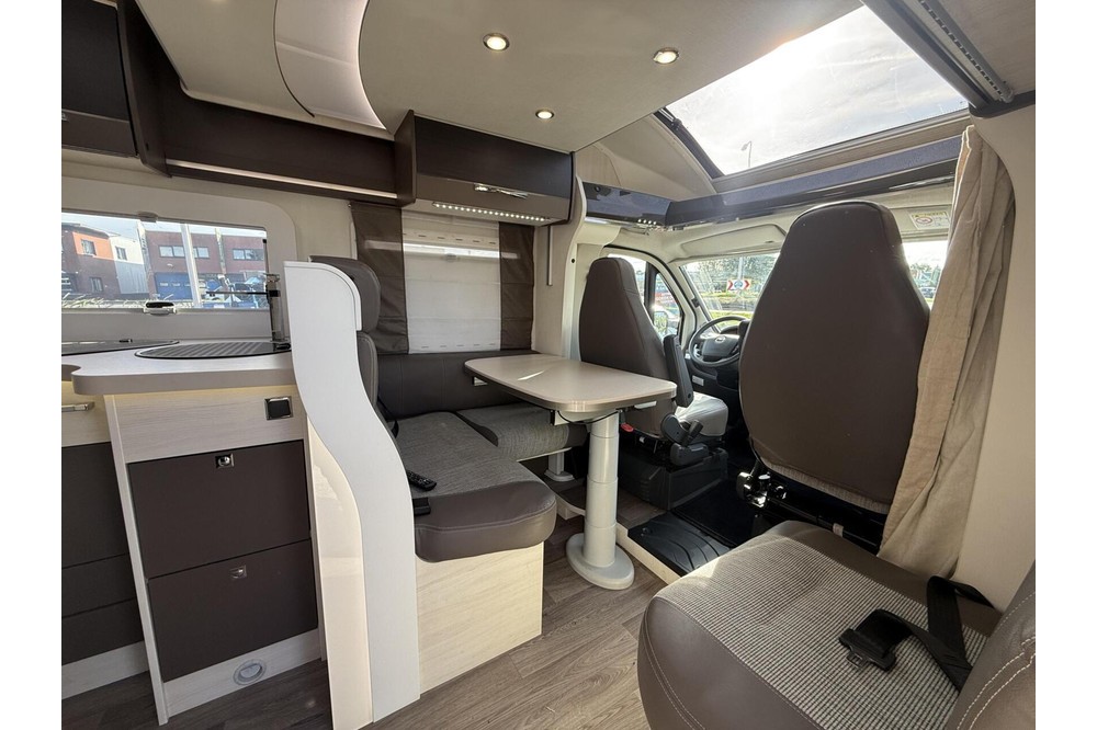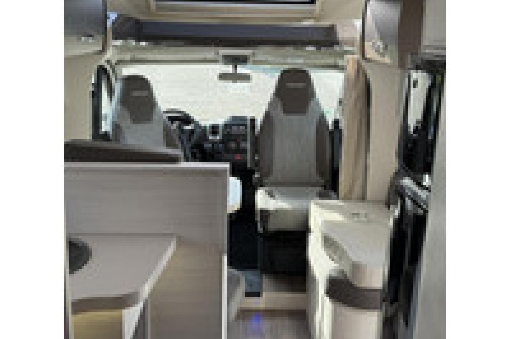 De camper is voorzien van een L-dinette, die gecombineerd met draaibare stoelen een gezellige rondzit vormt. Prachtig panorama dakraam geeft meer lichtinval. Verder heeft de camper een hoekkeuken met 3 pits gasfornuis, koel-vriescombinatie, douche en toilet in aparte ruimte. Bagage ruimte en opbergkasten zijn aanwezig. Door de extra luxe voorzieningen is deze camper geschikt voor een ideale vakantie.