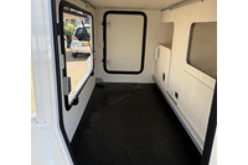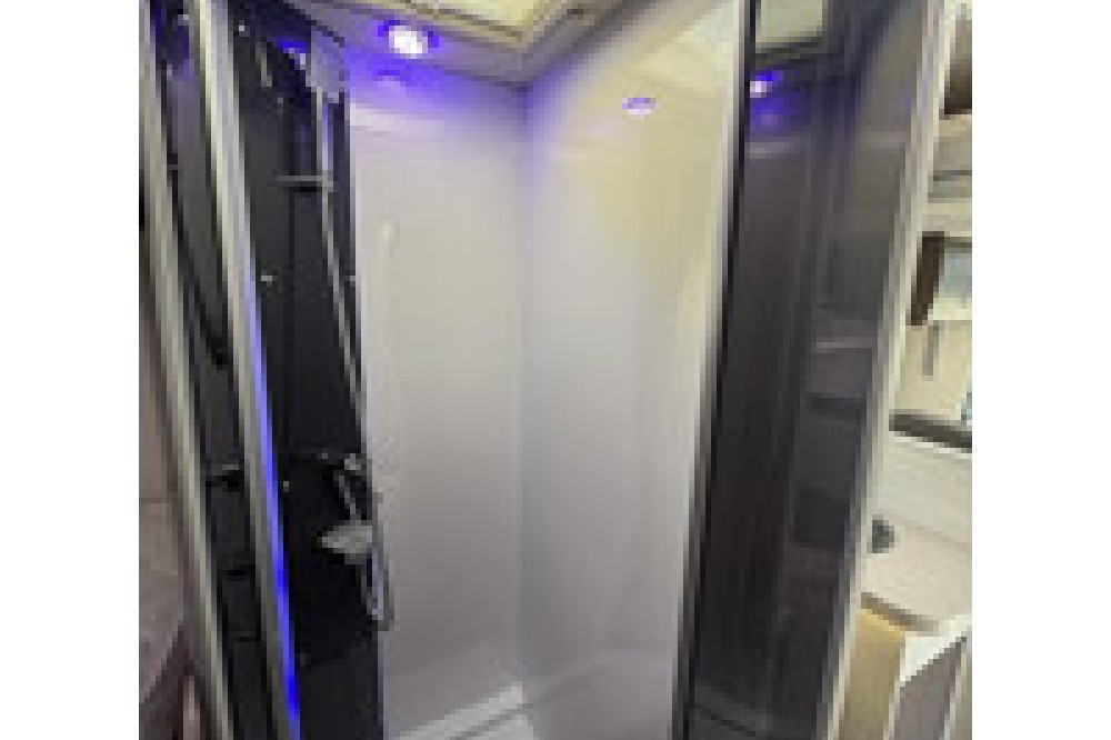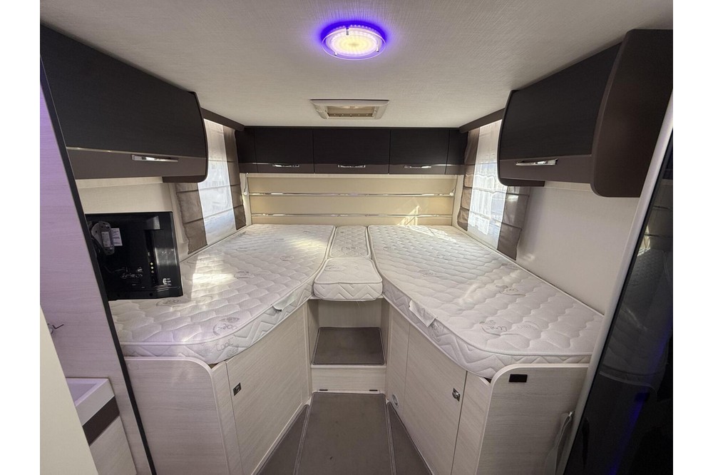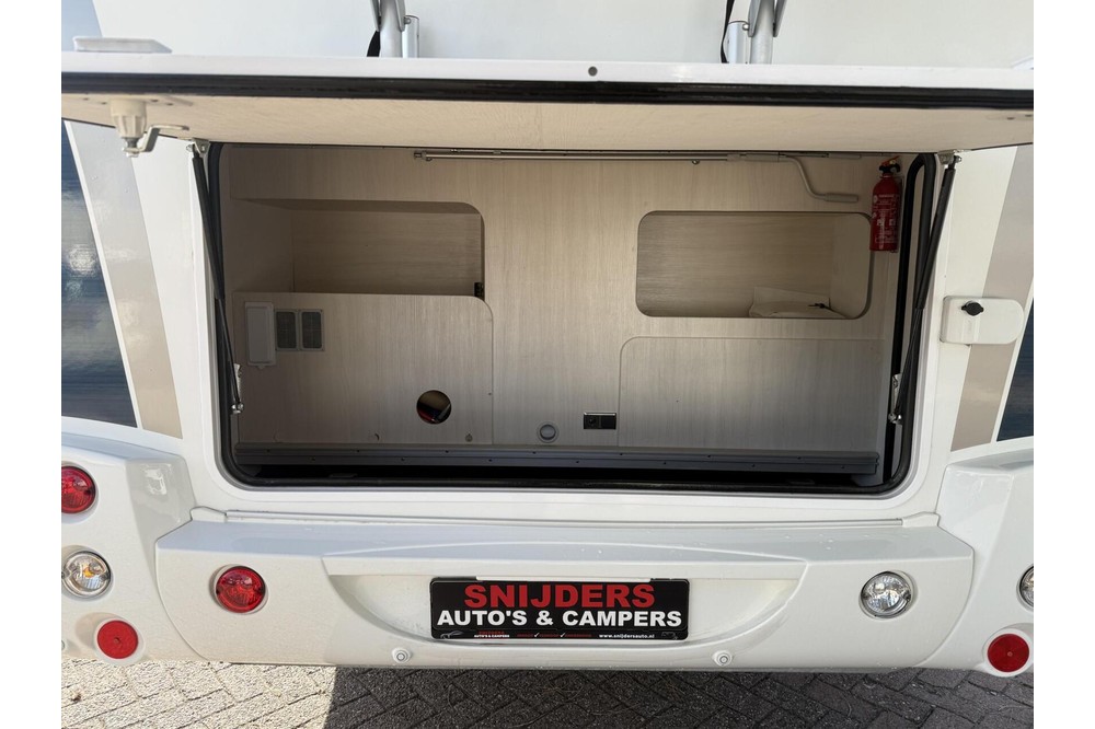 Aan de achterzijde bevinden zich de enkele bedden of een groot bed met daaronder bagageruimte voor tafel en stoelen etc. Boven de zitgroep is een elektrisch tweepersoons hefbed aanwezig.