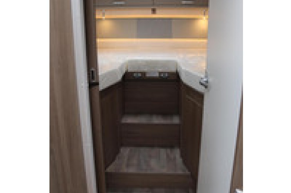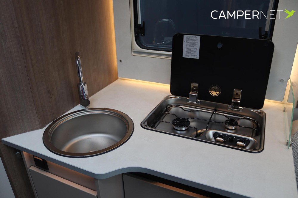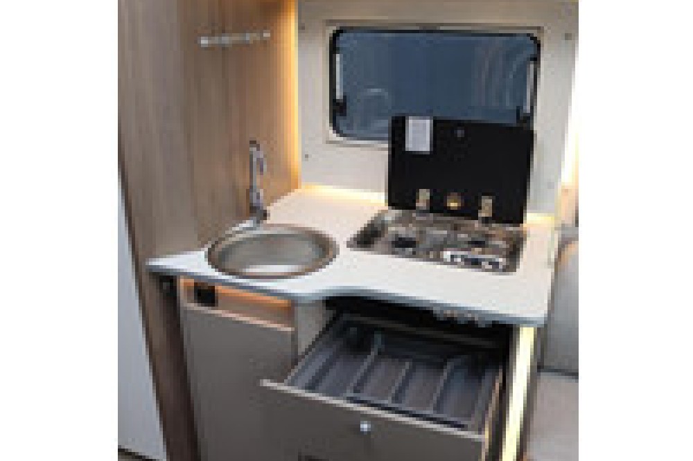 hoekkeuken maakt het mogelijk om heerlijke maaltijden te bereiden tijdens je avonturen onderweg zonder af te zien van het comfort van een goed uitgeruste keuken. De koelkast heeft standaard een inhoud van 98 liter en biedt genoeg ruimte om etenswaren vers en drankjes aangenaam koel te houden.