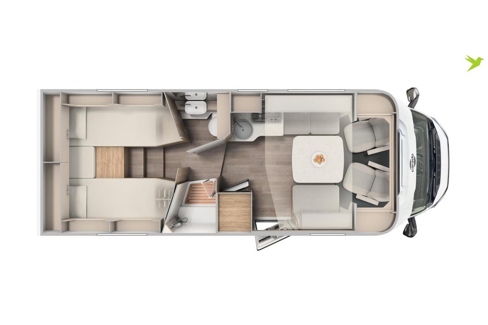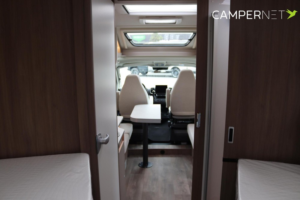 eenpersoonsbedden in het achterste gedeelte bieden niet alleen comfortabele slaapplaatsen, maar zorgen ook voor slim ruimtegebruik. Door de combinatie van badkamer en slaapgedeelte met kasten onder het bed is alles binnen handbereik en georganiseerd in een aparte ruimte.