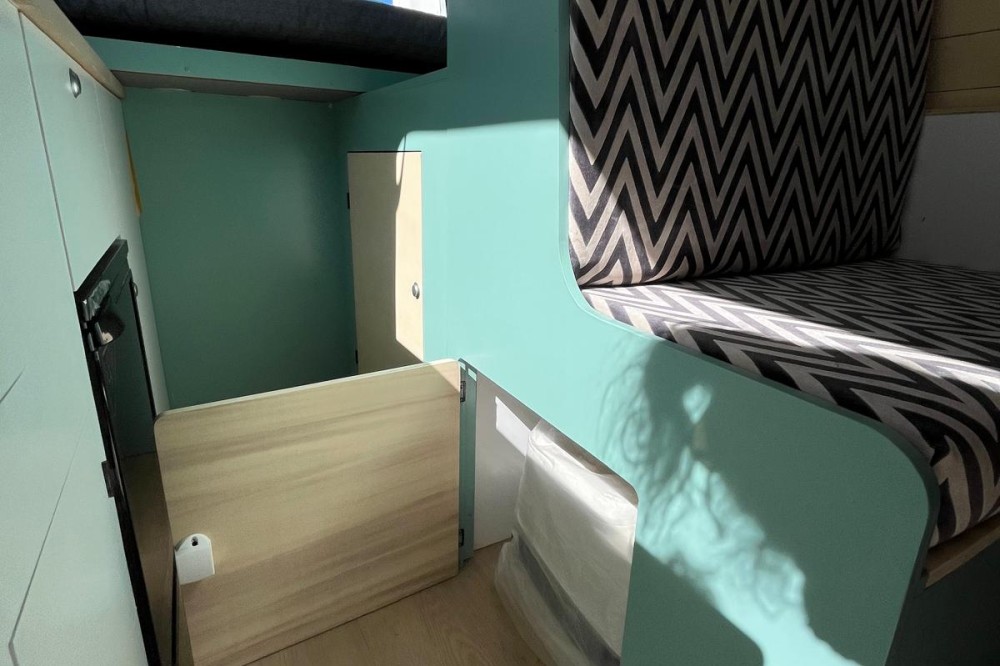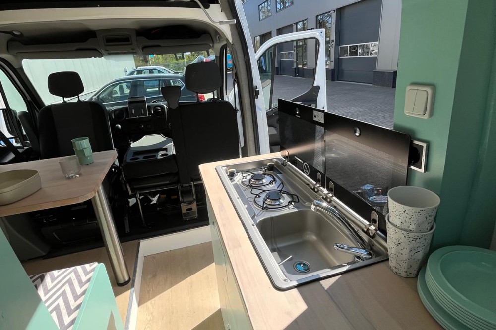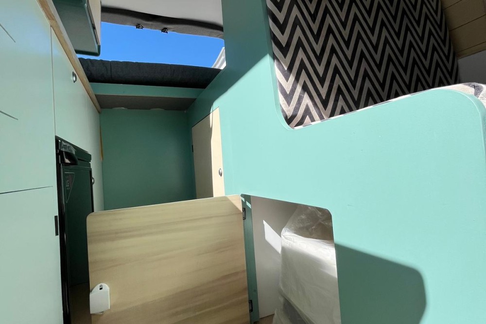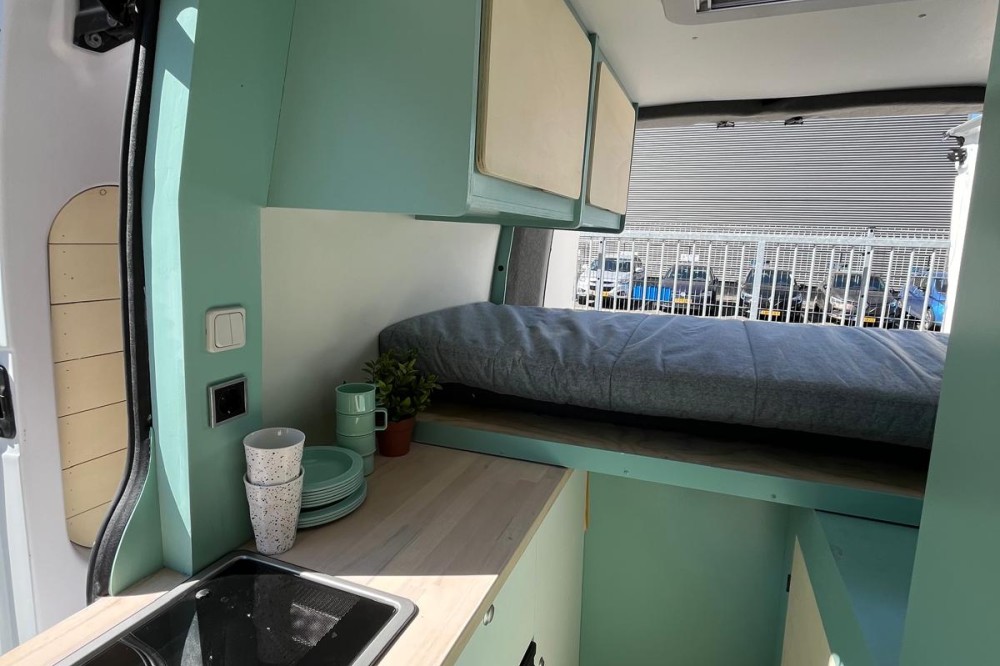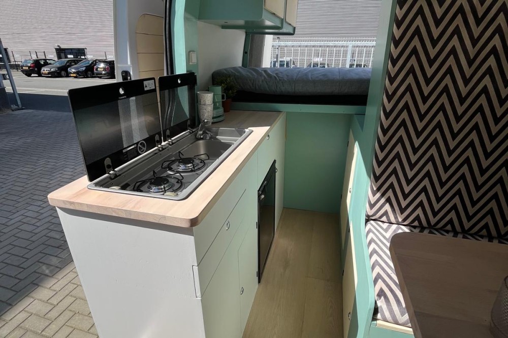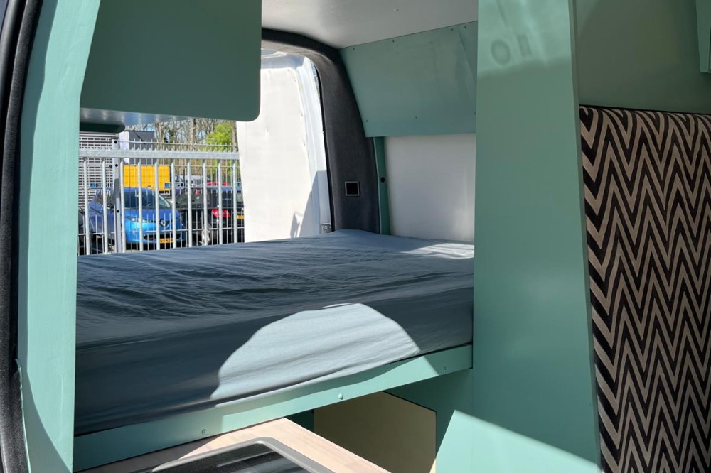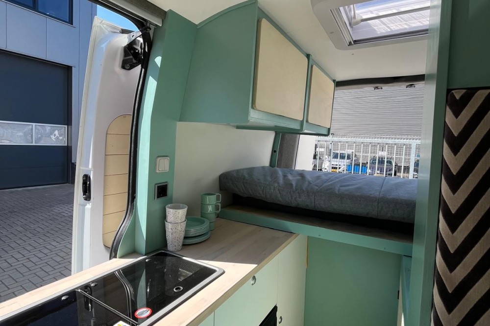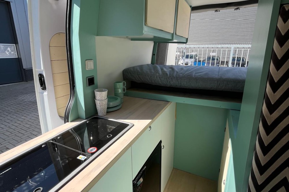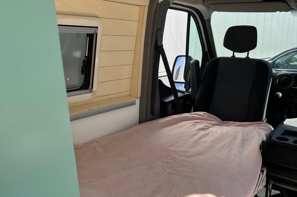 De camper beschikt over een twee persoonsbed (195 bij 145) Dit bed is makkelijk in en uit schuiven zodat er meer leefruimte onstaat in de bus. Daarnaast is het zitgedeelte om te bouwen naar een bed van 80cm breed en 185 lang. Ideaal wanneer je met zijn drieen reist.