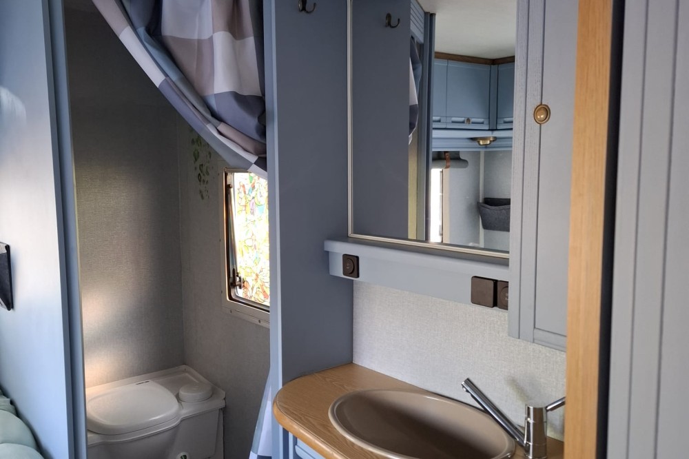 Toiletruimte met (buiten)douche en voorzien van Thetford C2 cassettetoilet