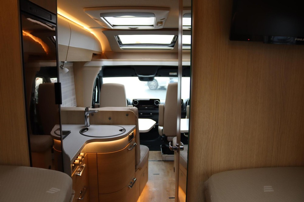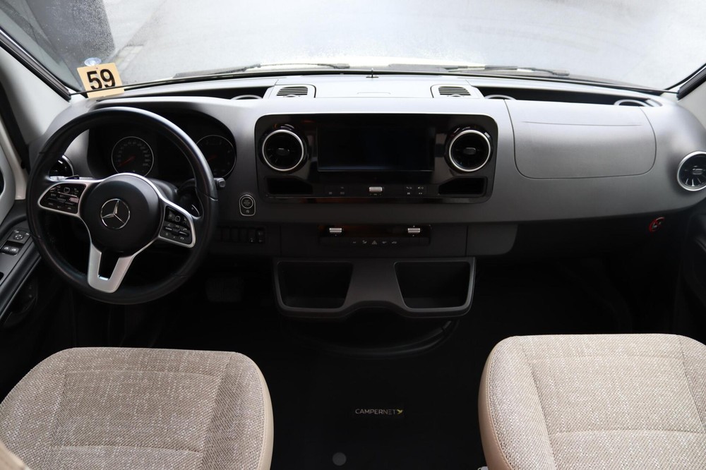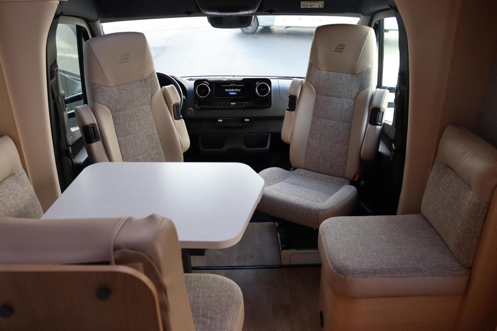 Panorama cabine met toptechnologieIn de cabine van de Hymer BMC-T 600 geniet je van een panoramisch uitzicht, zodat je niet alleen de omgeving optimaal kunt bewonderen, maar ook tijdens het rijden goed overzicht hebt op het verkeer. Het Mercedes-Benz MBUX multimedia systeem zorgt voor een soepele navigatie- en entertainmentervaring, terwijl de luxe pilotenstoelen, die verstelbaar en draaibaar zijn, het comfort verhogen.