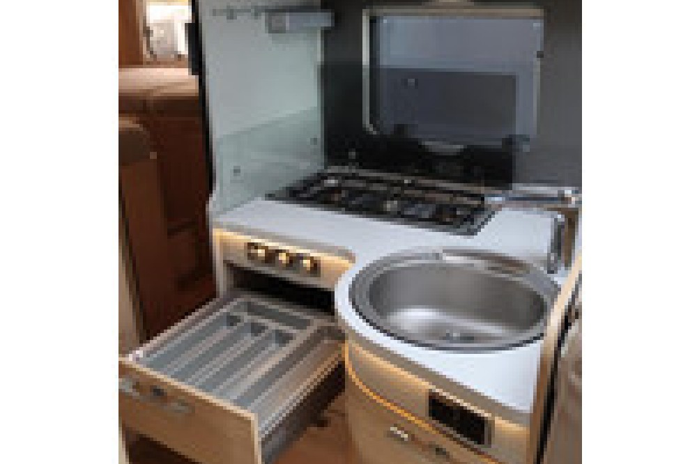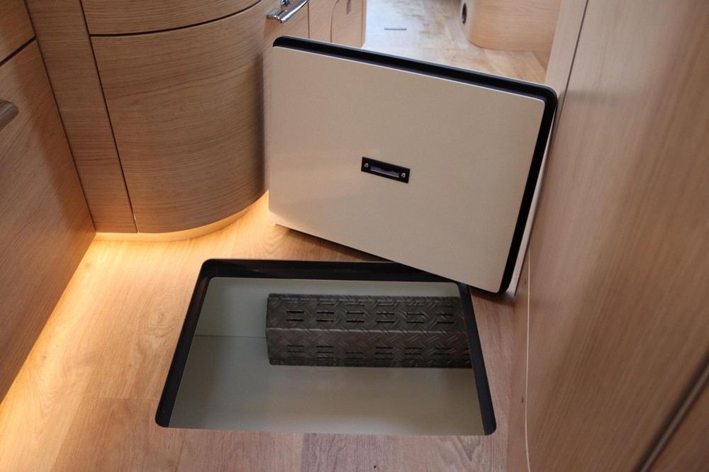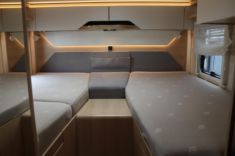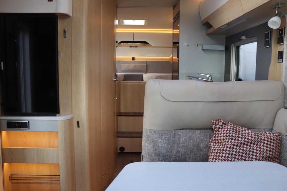 Luxe en praktische detailsDe Hymer BMC-T 600 biedt een ruime zithoek met een L-zit die ontstaat door de draaibare voorstoelen. Het elegante Grand Oak meubeldecor in combinatie met de luxe Creola bekleding zorgt voor een verfijnde uitstraling. Dankzij de dubbele bodem, die verwarmd is en extra opbergruimte biedt, kun je jouw spullen veilig en droog opbergen. De 180 liter schoonwatertank en de 150 liter vuilwatertank zijn weggewerkt in de dubbele bodem, terwijl je vanuit de buitenkant eenvoudig toegang hebt tot de opslagruimte. De ruime garage heeft een laadhoogte van 132 cm, is aan beide zijden toegankelijk en biedt voldoende ruimte voor uw fietsen, scooter en bagage.