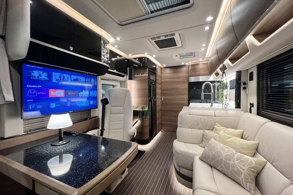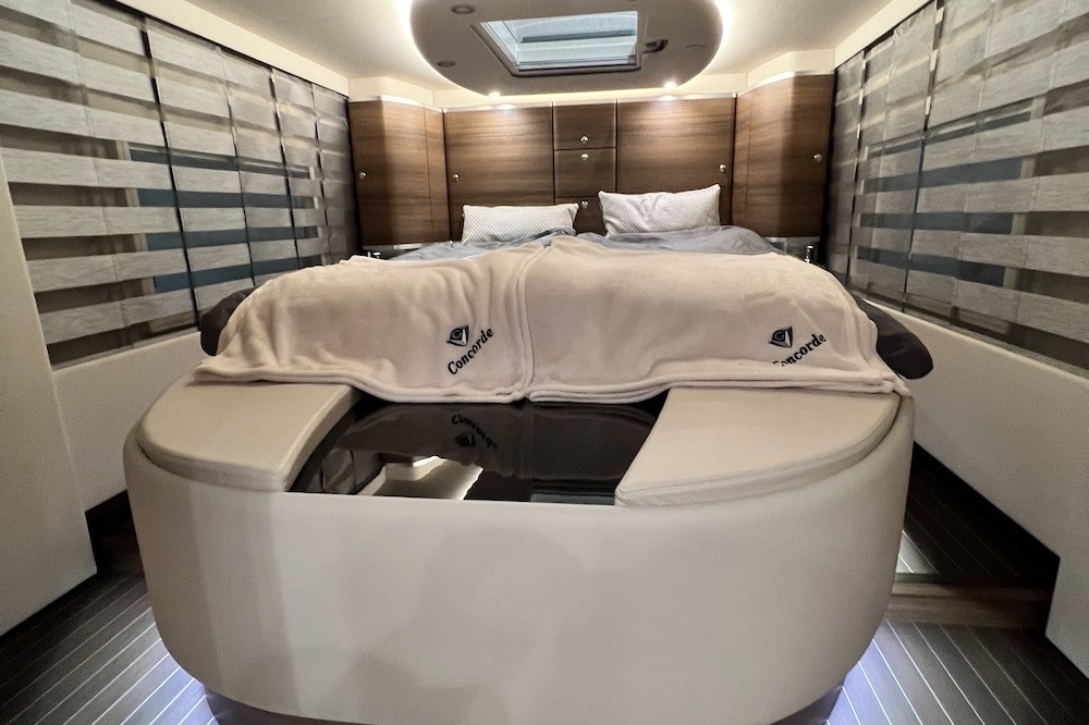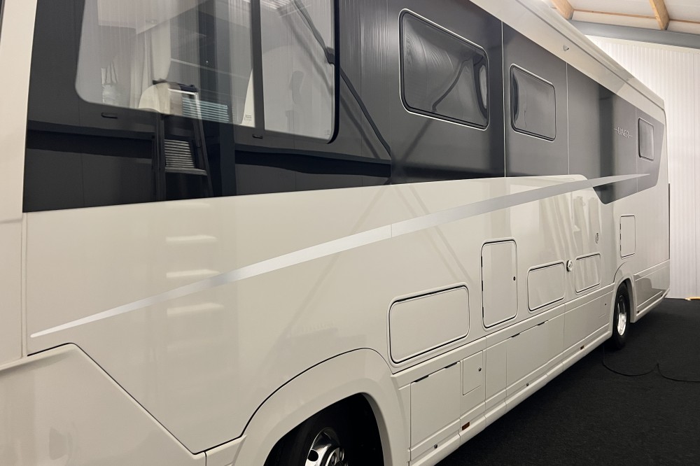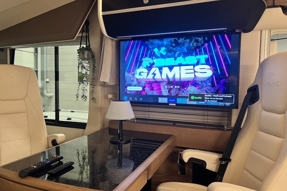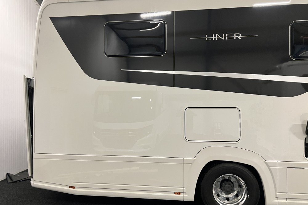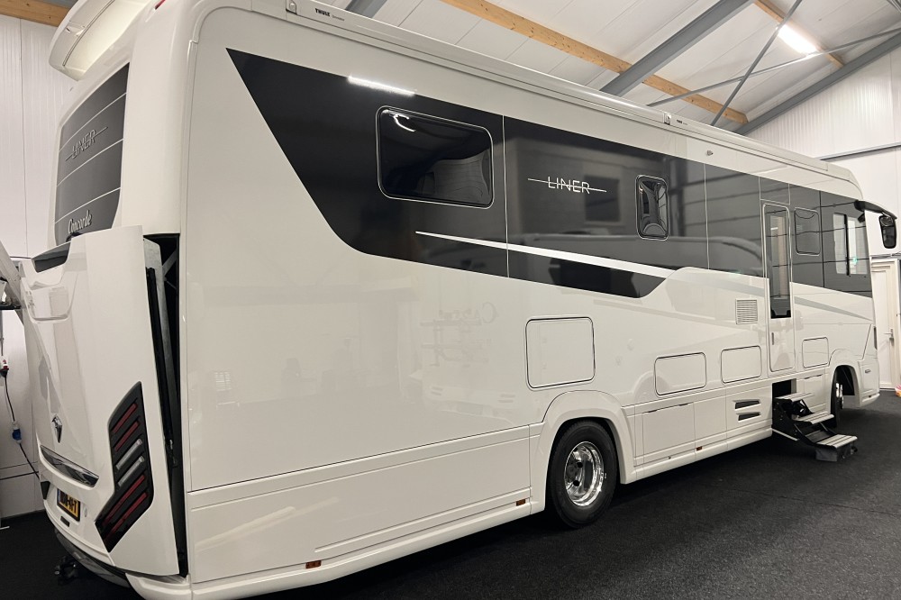 Deze Concorde Liner wordt ook wel "Landyacht" genoemd en is uitgevoerd in de luxe "Centurion Style" dit betekend een yachtstyle teak dek "Soft-Walk" vloer met Jatoba Brilliant gekleurde kastdeuren, Luxaflex in hout optiek living, buiten bestickering Centurion, donkere "Privacy Black" getinte ramen en busspiegels wit gespoten