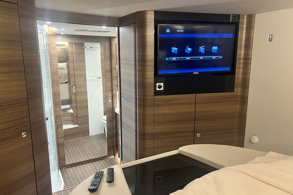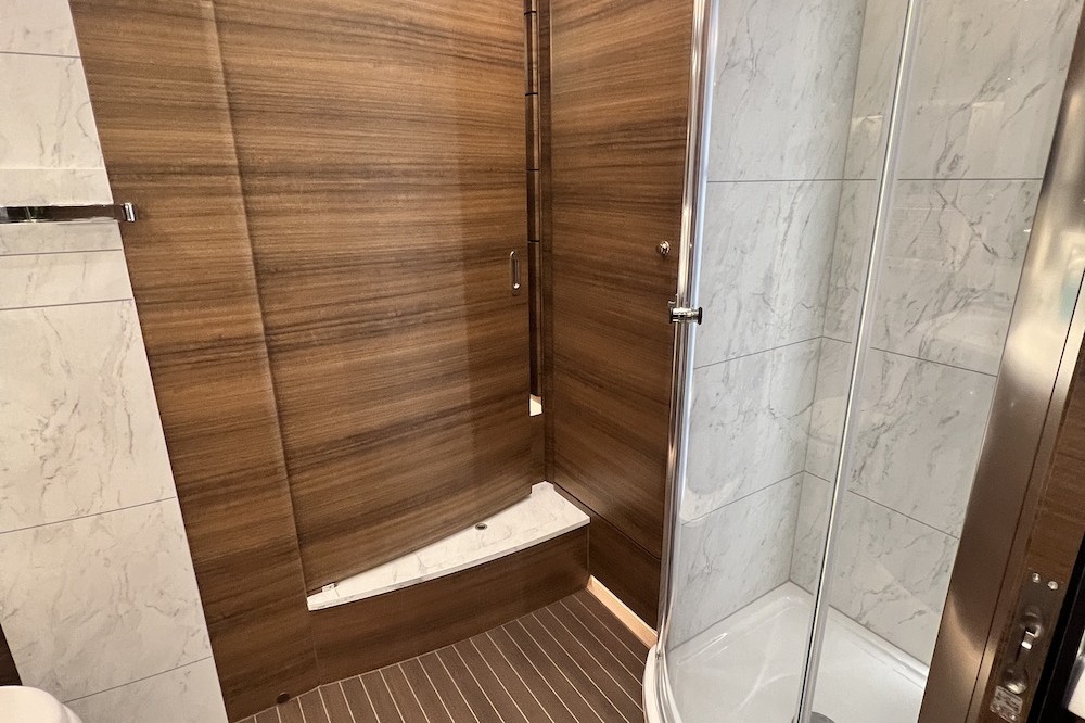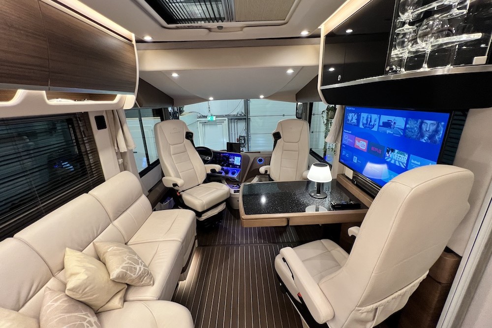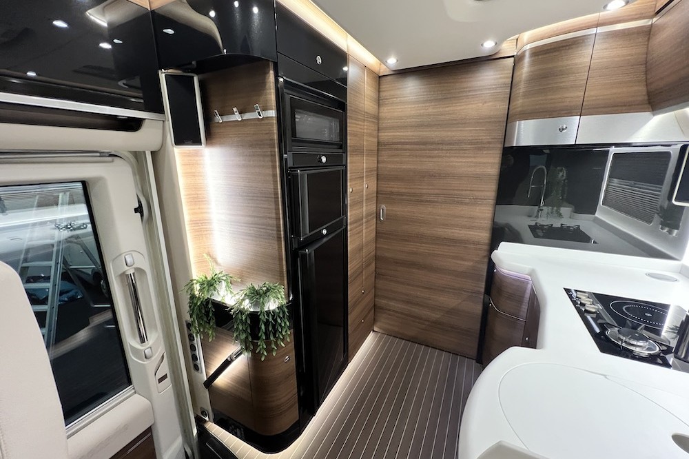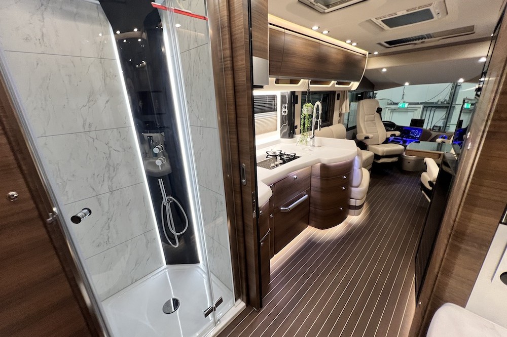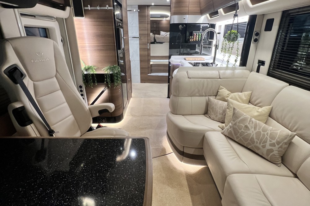 Deze Concorde Liner wordt ook wel "Landyacht" genoemd en is uitgevoerd in de luxe "Centurion Style" dit betekend een yachtstyle teak dek "Soft-Walk" vloer met Jatoba Brilliant gekleurde kastdeuren, Luxaflex in hout optiek living, buiten bestickering Centurion, donkere "Privacy Black" getinte ramen en busspiegels wit gespoten