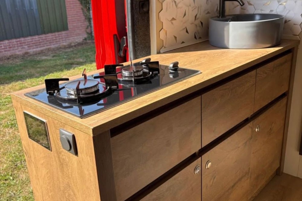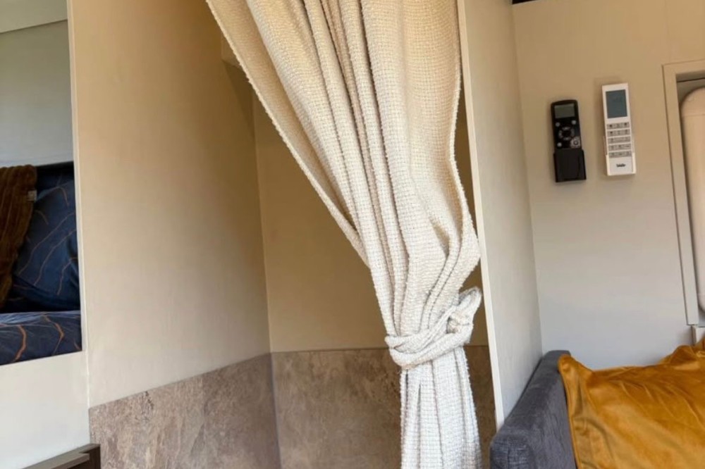 - Het is goed vertoeven in en om de bus met een dakairco die kan koelen en verwarmen en een ingebouwde ventilator. Maar ook een extra brede casetteluifel die je voorziet van extra schaduw.