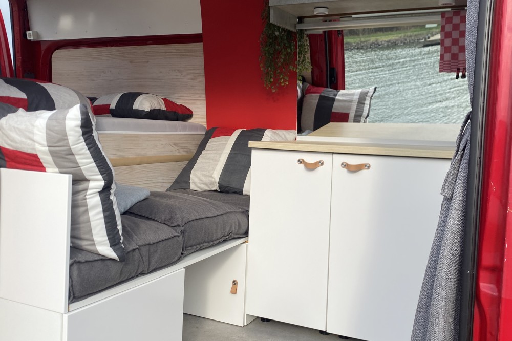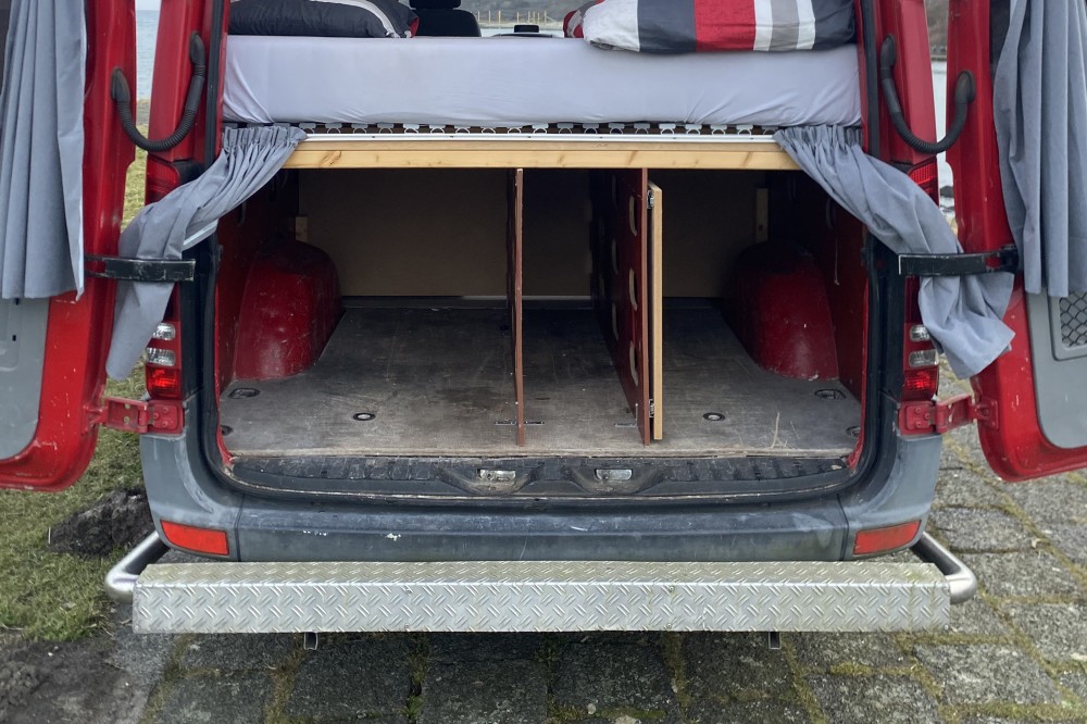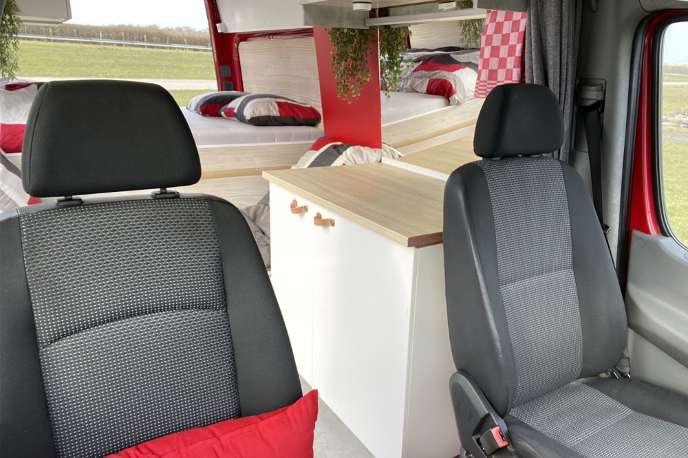 Deze zeer ruime zelfbouw 2/3-pers. camperbus uit 2013 heeft ± 155.000 km gereden. Hij heeft een groot dwarsbed (145x185cm) met lattenboden. De zitbank (60x180cm) kan als extra bed worden gebruikt. De in 2024 gebouwde living bevat verder een keukenblok met aanrecht en spiegel, boven- en onderkasten en een (boot)koel/vriescombinatie op accu en stroom. Losse oven en kookstel bevinden zich in de keukenkast. De meterkast onder de (bed)bank bevat nieuw, hoogwaardig apparatuur. Onder het dwarsbed met luxe matras is een grote garage (155x185x70cm) met 2 tussenwanden en afdekgordijn. De bus heeft kleurverschil in de lak door oude bestickering, rondom robuuste bars en op het dak 2 dakluiken.