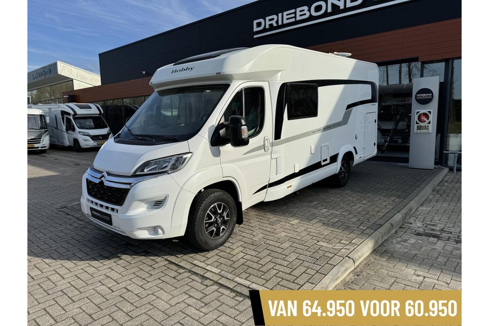 Een prachtige camper, deze Hobby V65 GE Optima Ontour uit Juli 2019 . Deze camper is zeer goed onderhouden en verkeerd in zeer mooie staat en is afkomstig van eerste eigenaar . Het betreft een compacte camper met toch een ruime indeling. De camper heeft een ruime rondzit dmv draaistoelen, een Ruime keuken een en mooie werkruimte met en grote koelkast met vriezer , een royale douche/toilet ruimte, en 2 enkele bedden die om zijn te bouwen naar en groot bed met daaronder een Grote garage. Uiteraard is deze camper van alle gemakken voorzien, zoals o.a. Motor Airco, een Multimedia pakket Achteruitrijcamera , Grote garage , Tv , Automatische schotel , Hordeur , Plissé verduistering , Fietsenrek , en nog veel meer.