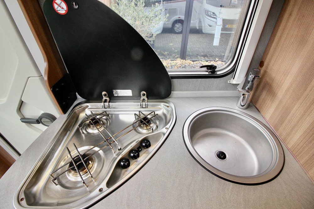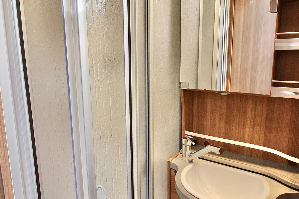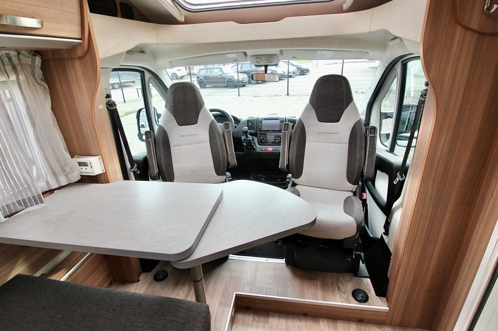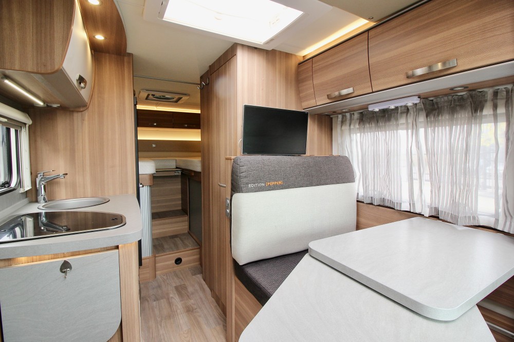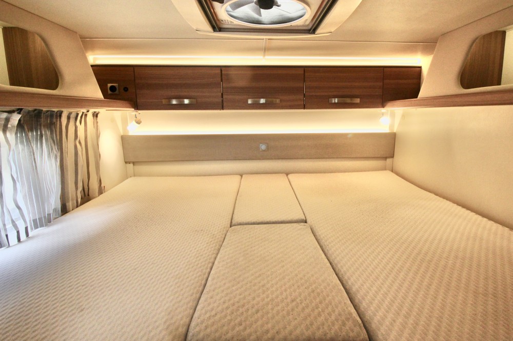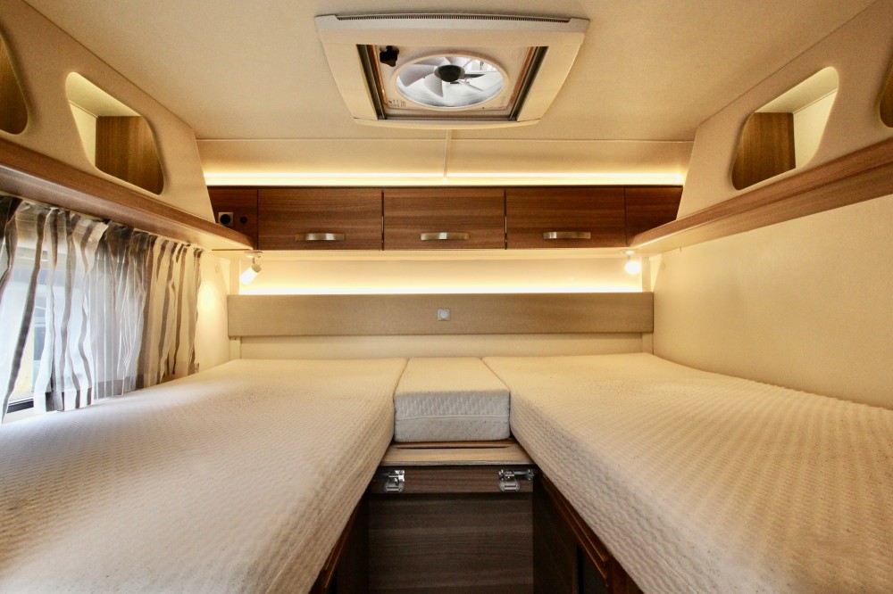 Achterin 2 lengtebedden (195×80+190×80) om te bouwen tot groot bed, de badkamer met een draaibaar toilet, wastafel en een afsluitbare douche, de keuken is voorzien van een 3-pits gaskomfoor met vonkontsteking, RVS spoelbasin, koelkast met vriesvak, een 4-persoons dinette, om te bouwen tot slaapplaats.