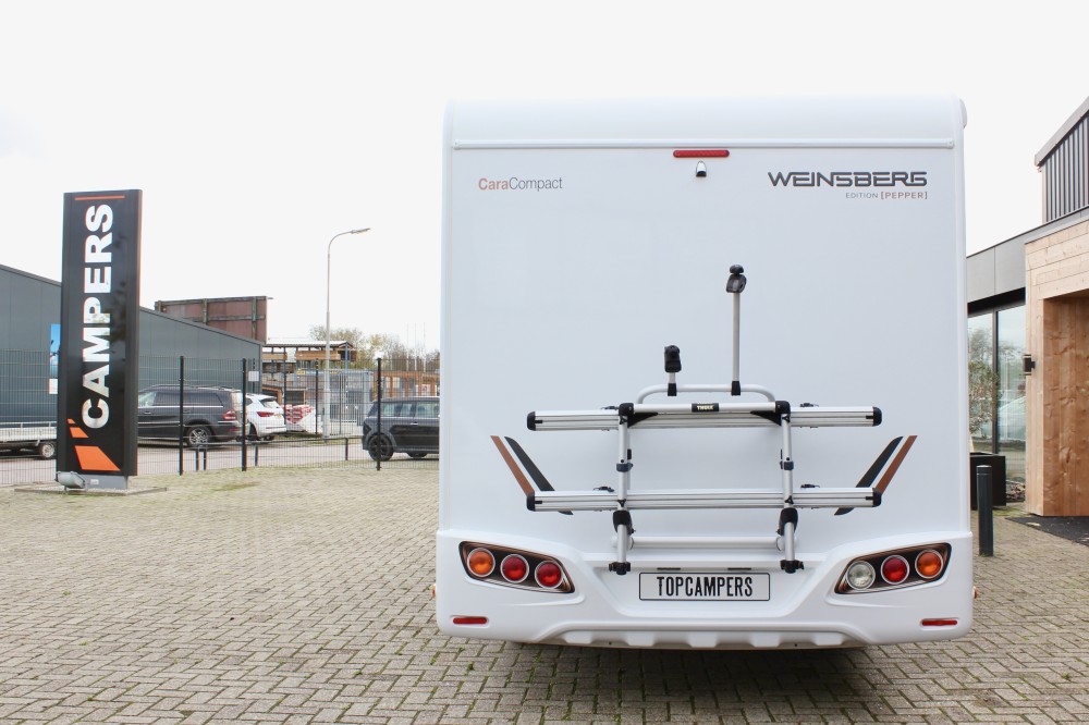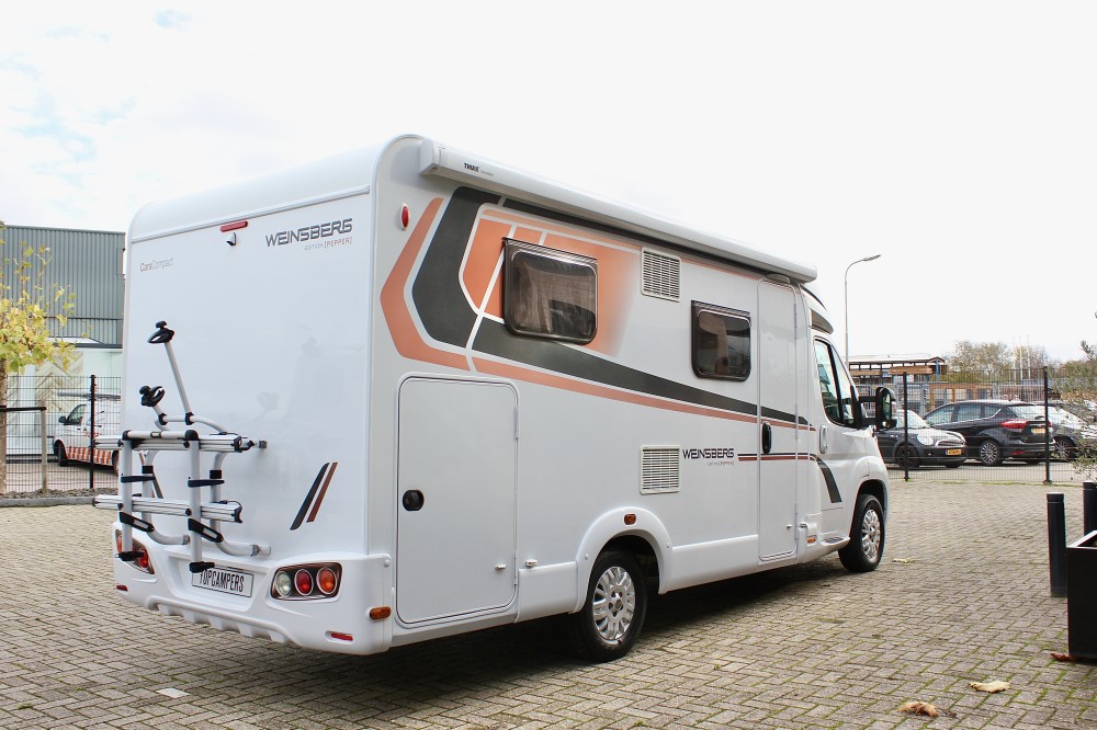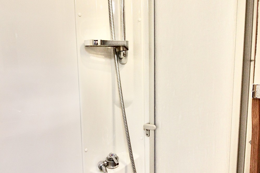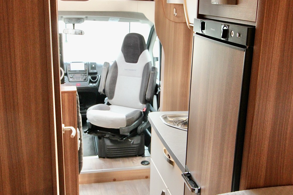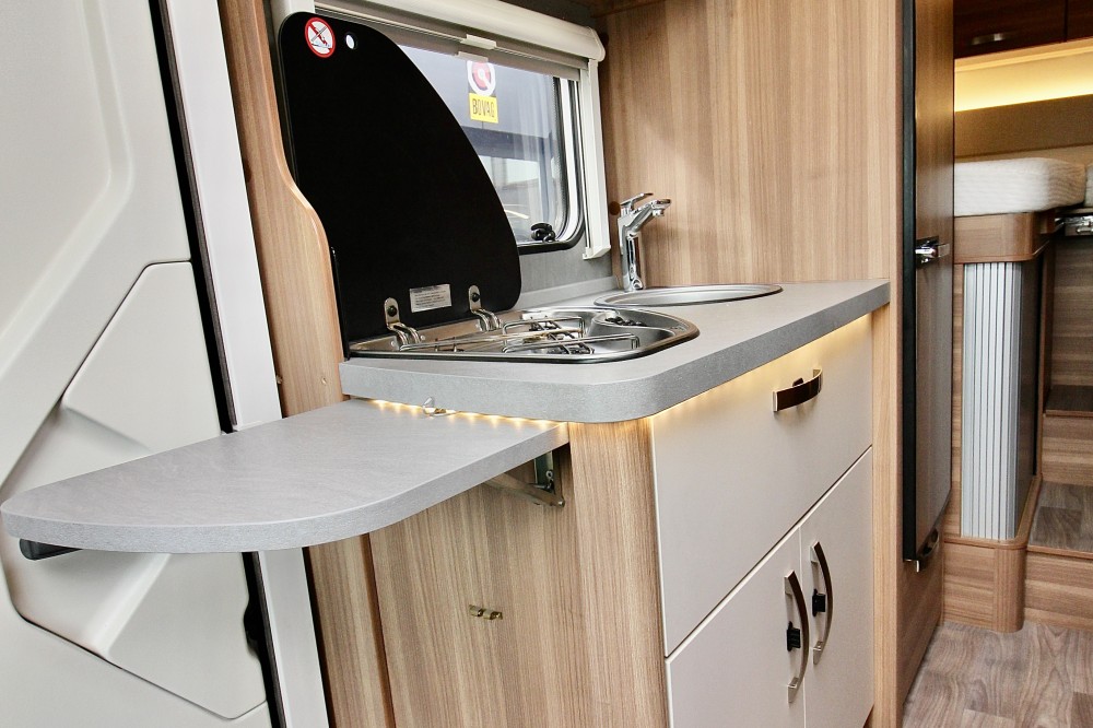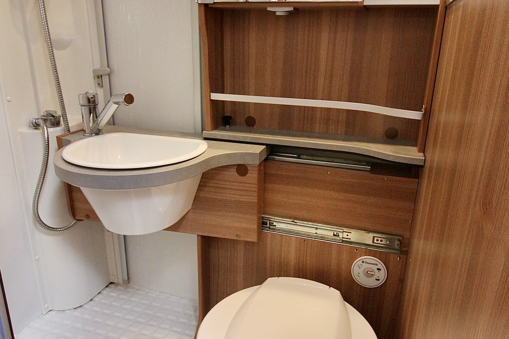 Achterin 2 lengtebedden (195×80+190×80) om te bouwen tot groot bed, de badkamer met een draaibaar toilet, wastafel en een afsluitbare douche, de keuken is voorzien van een 3-pits gaskomfoor met vonkontsteking, RVS spoelbasin, koelkast met vriesvak, een 4-persoons dinette, om te bouwen tot slaapplaats.