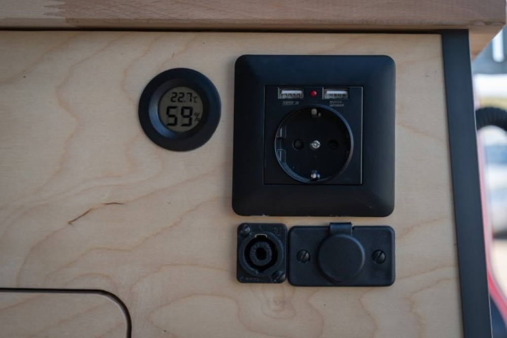 De camper is verder voorzien van USB laadpoorten, 230V stopcontacten, 12V en 24V. Eén zonnepaneel (150W) en deze levert bij zonnig weer voldoende vermogen voor ca. 48 uur 'Off-Grid' gebruik. De AGM huishoudaccu wordt geladen tijdens het rijden, door de zonnepanelen en bij aansluiting op walstroom door de Victron smartcharger.