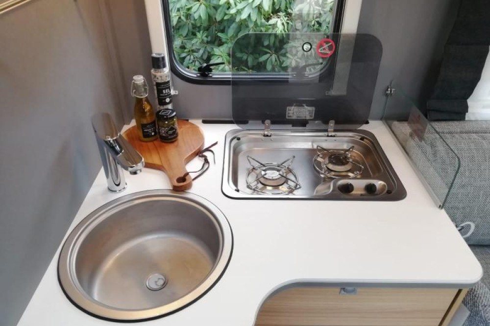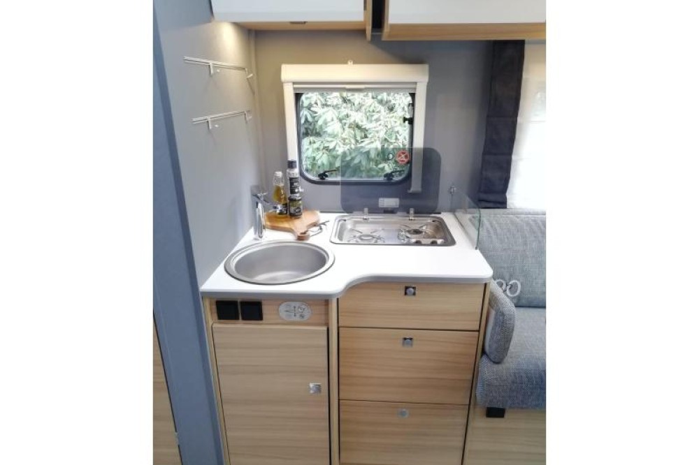 Het keukenblok is centraal in de camper gemonteerd en is onder anderen uitgerust met 2-pits gascomfoor, spoelbak en kraan. Voor een snelle toevoer van warm water is er een boiler aanwezig. De XXL koelkast met vriesvak biedt voldoende ruimte voor heel uw voorraad.