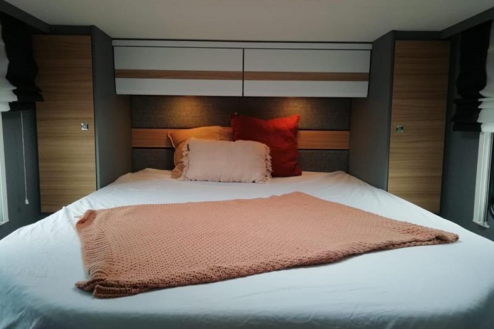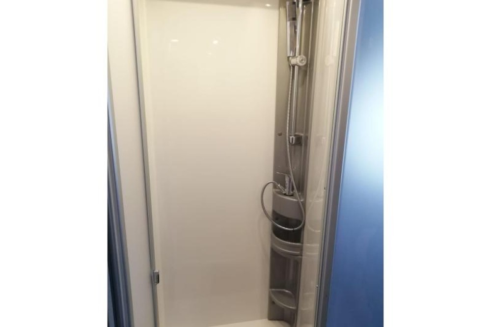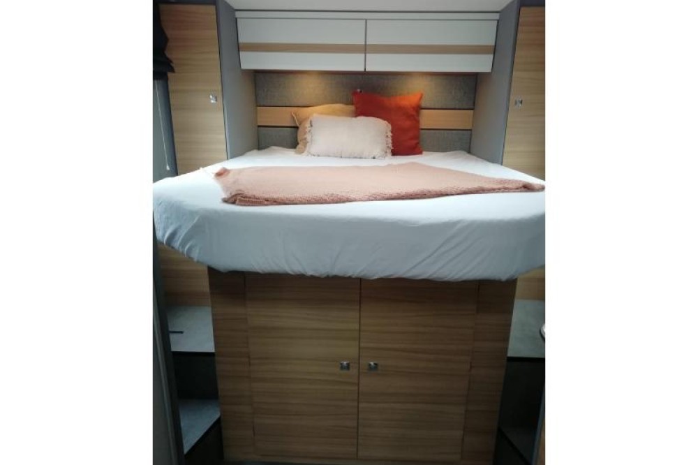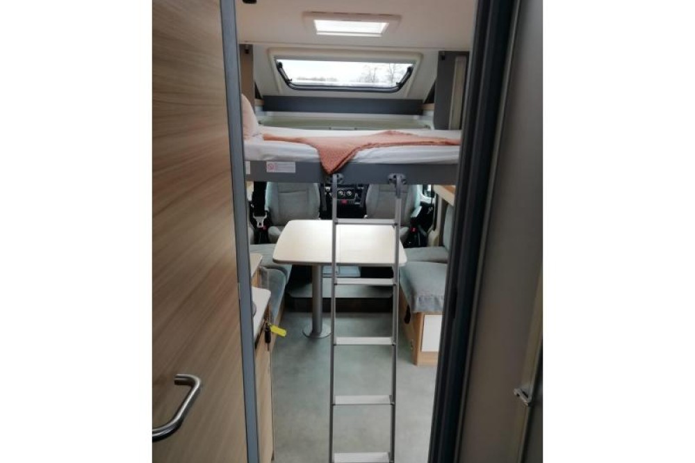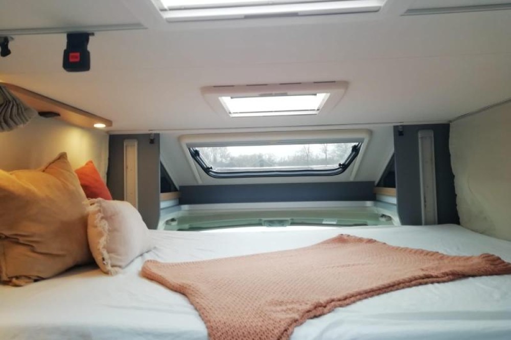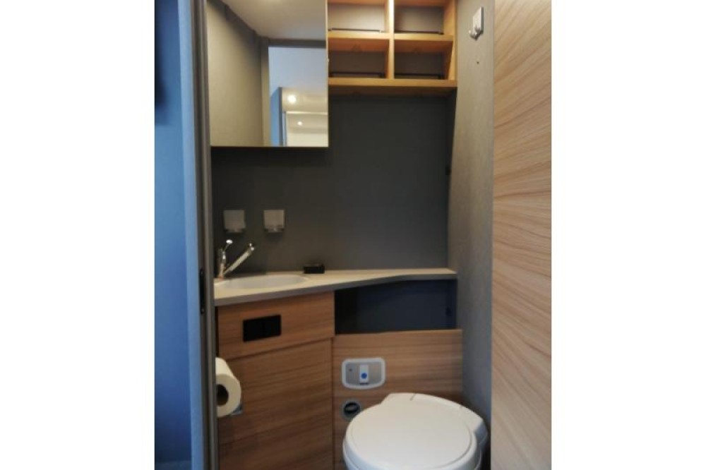 U zult de gemakkelijk instap aan beide kanten van dit vrijstaande queensbed zeker waarderen. Dit queensbed heeft een lengte van 190 cm en is 140 cm breed. Er wordt veel ruimte bespaard door het gebruik van het tweepersoons hefbed boven de zitgroep. Dit hefbed heeft een lengte van 200 cm en is 140 cm breed. In de comfortabele badkamer van deze camper vindt u behalve een wastafel ook een ingebouwd cassettetoilet. Er is bovendien een doucheruimte in de camper, zodat u van uw eigen douche gebruik kunt maken.