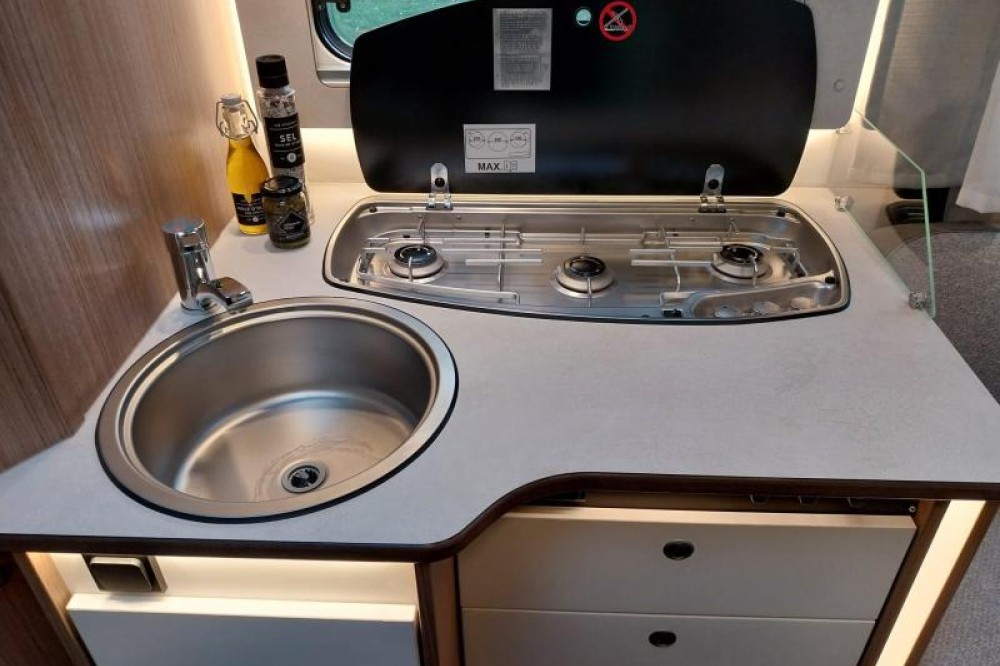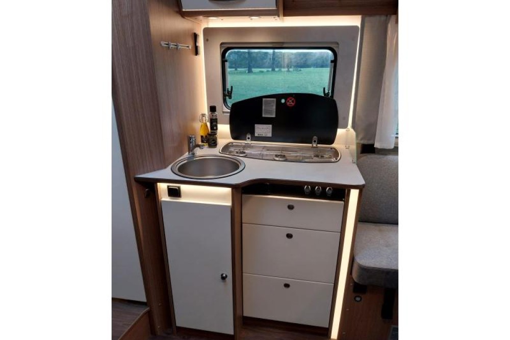 Centraal in de camper bevindt zich de middenkeuken, uitgerust met een spoelbak, kraan en 3-pits kooktoestel. De boiler, die in de camper is ingebouwd, voorziet u snel van warm water. De ingebouwde koelkast met vriesvak is uitgevoerd in een ruime uitvoering. Door de ruime Face to Face zit geeft deze camper een enorm ruimte gevoel
