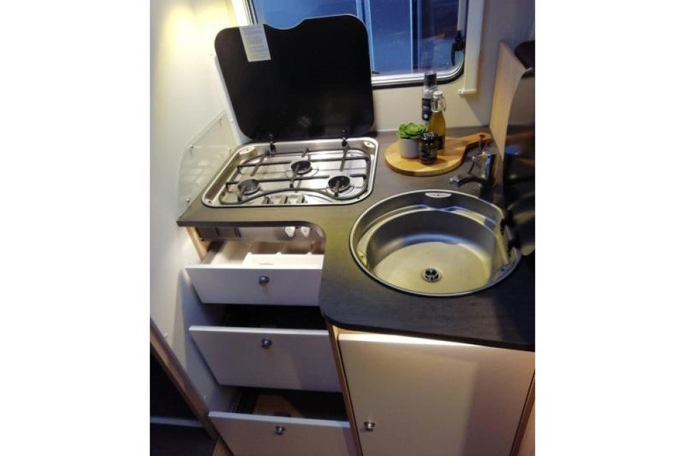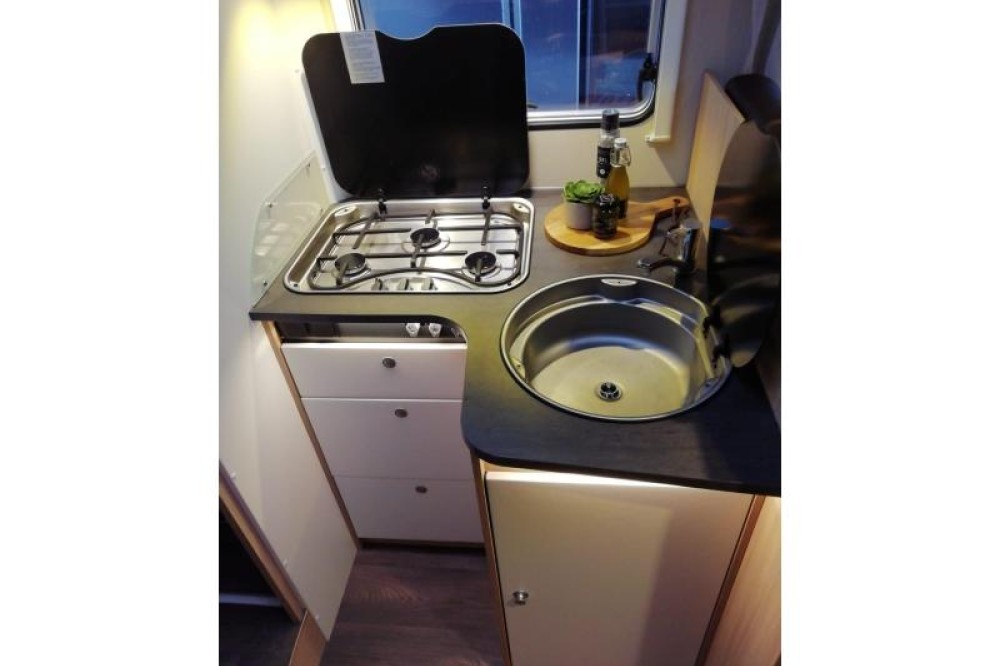 In de praktische, sfeervolle L-zit kunt u gezellig met elkaar eten en drinken. De keuken is in het midden van de camper geplaatst en beschikt over een 3-pits kooktoestel en gootsteen met kraan. Er is een boiler aanwezig, die u van warm water voorziet. Om uw etenswaren op te bergen is er een XXL koelkast met vriescompartiment ingebouwd.