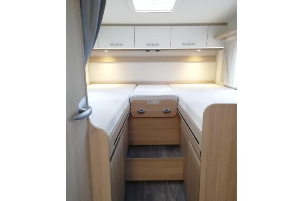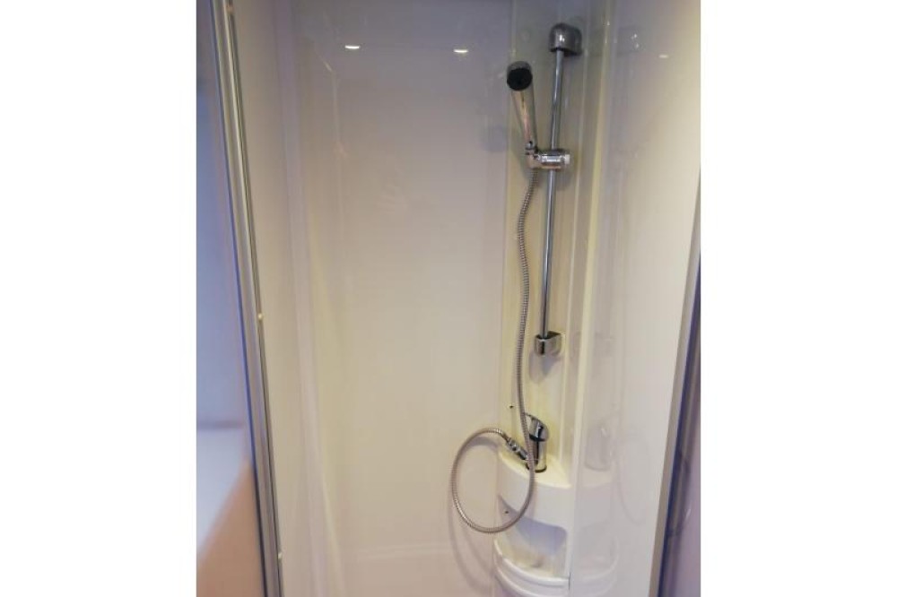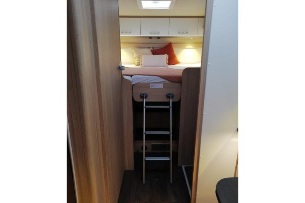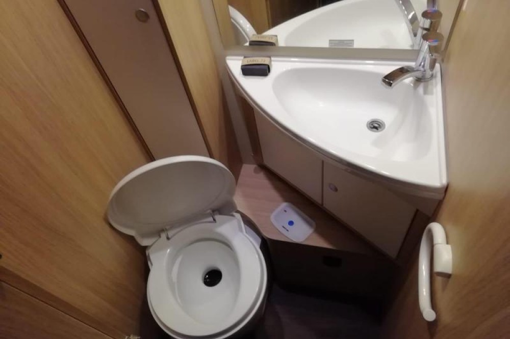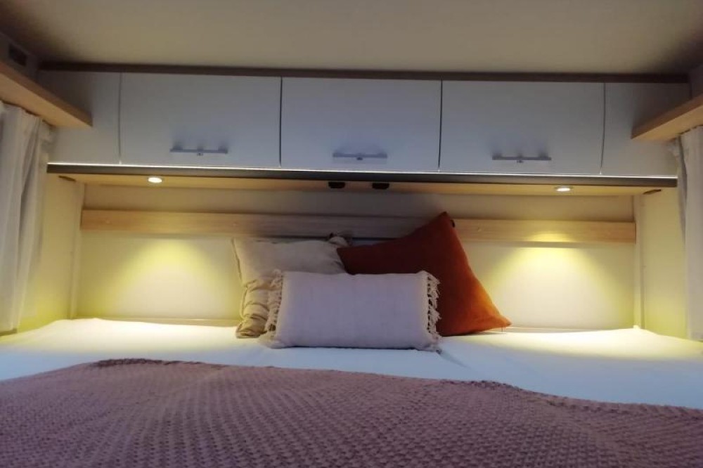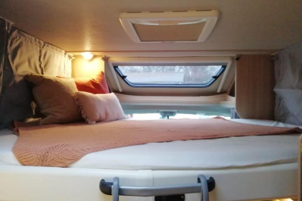 In de camper vindt u onder meer een ruim tweepersoons bed dat in de lengte is geplaatst. Deze bedden hebben een lengte van 200/ 190 cm en zijn beide 83 cm breed. Deze bedden kunnen ook samen als één groot bed gebruikt worden. Dan heeft dit bed een lengte van 200 cm en is 200 cm breed. Er wordt veel ruimte bespaard door het gebruik van het tweepersoons hefbed boven de zitgroep. Dit hefbed heeft een lengte van 200 cm en is 140 cm breed. De badkamer biedt gelegenheid om u aan de wastafel op te frissen en er is tevens een cassettetoilet. Naast het slaapgedeelte bevindt zich ook de douchegelegenheid.