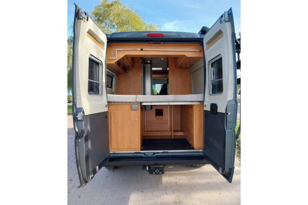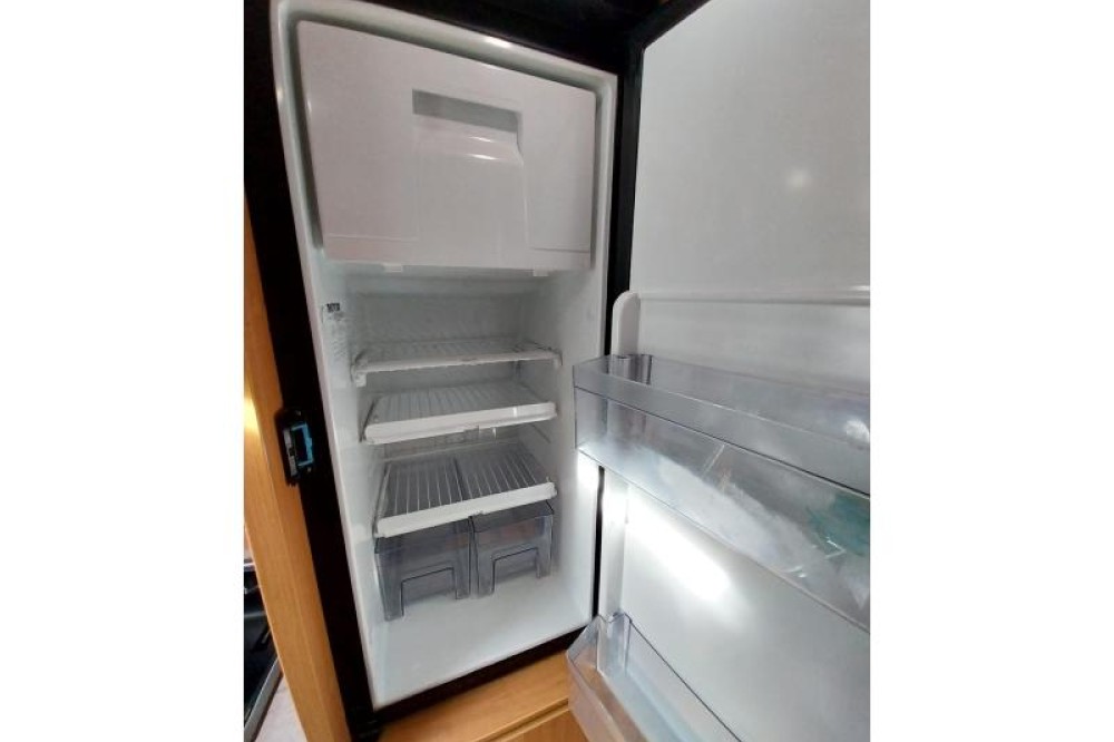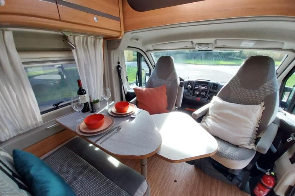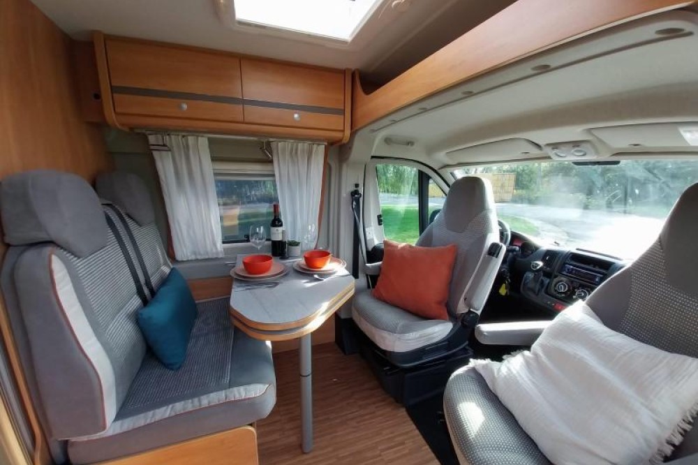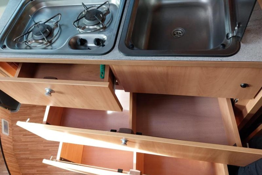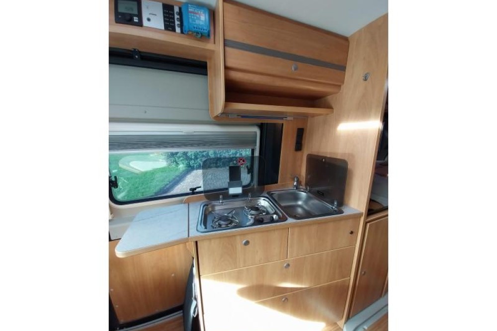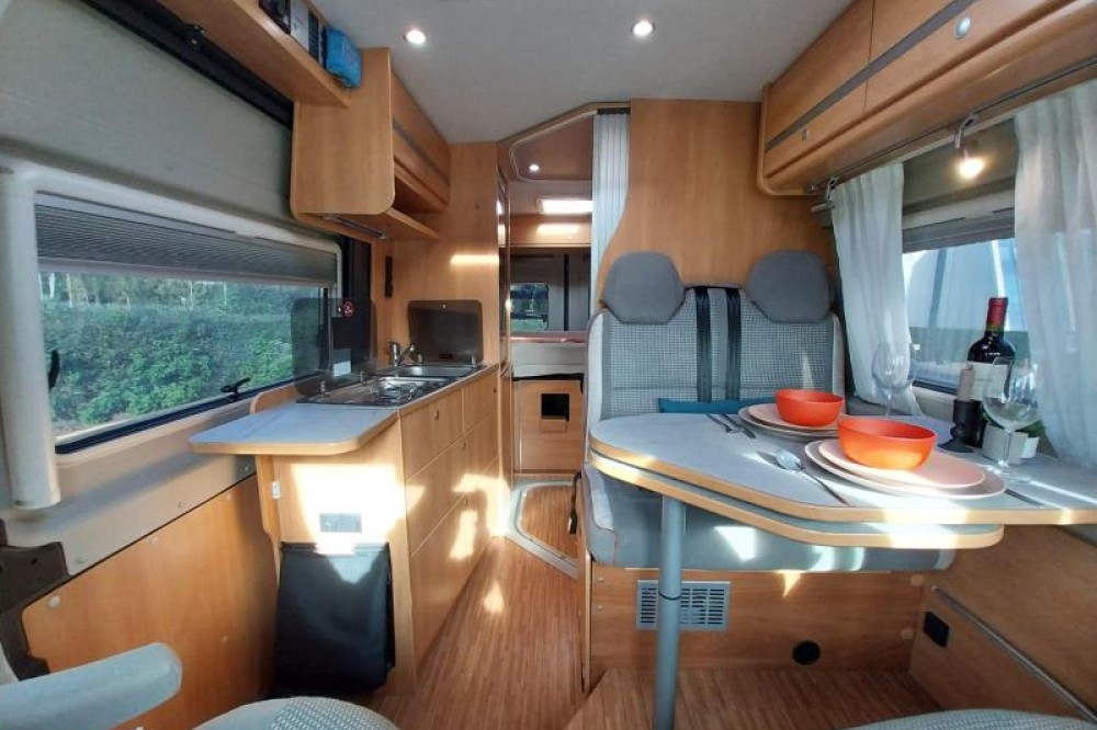 De camper beschikt over een treinzit, om aan het einde van de dag samen ontspannend te eten en te drinken. De keuken is in het midden van de camper gemonteerd en beschikt onder meer over een 2-pits kooktoestel en gootsteen met kraan. Voor een snelle toevoer van warm water is er een boiler aanwezig. Om uw etenswaren makkelijk op te bergen is er een ruime ladekoelkast met vriescompartiment ingebouwd.