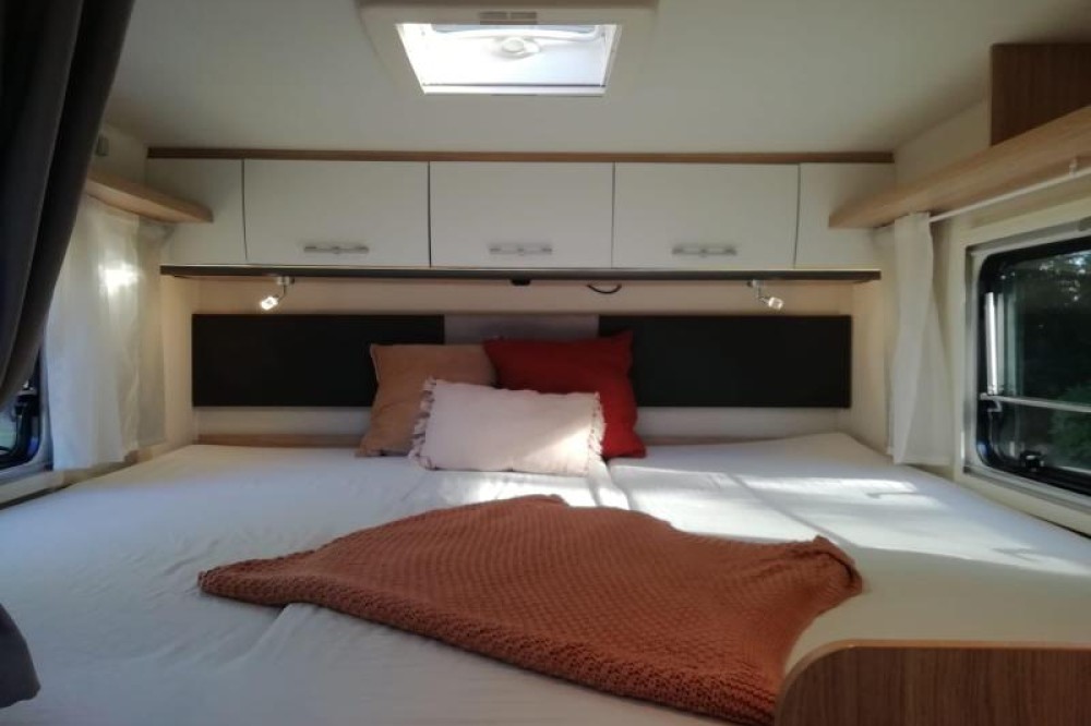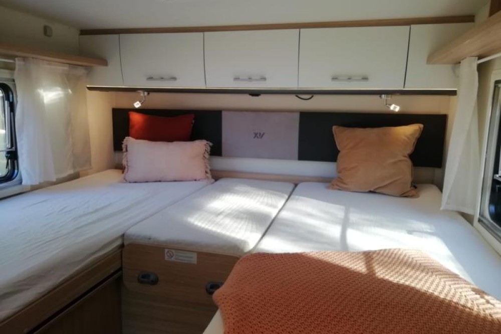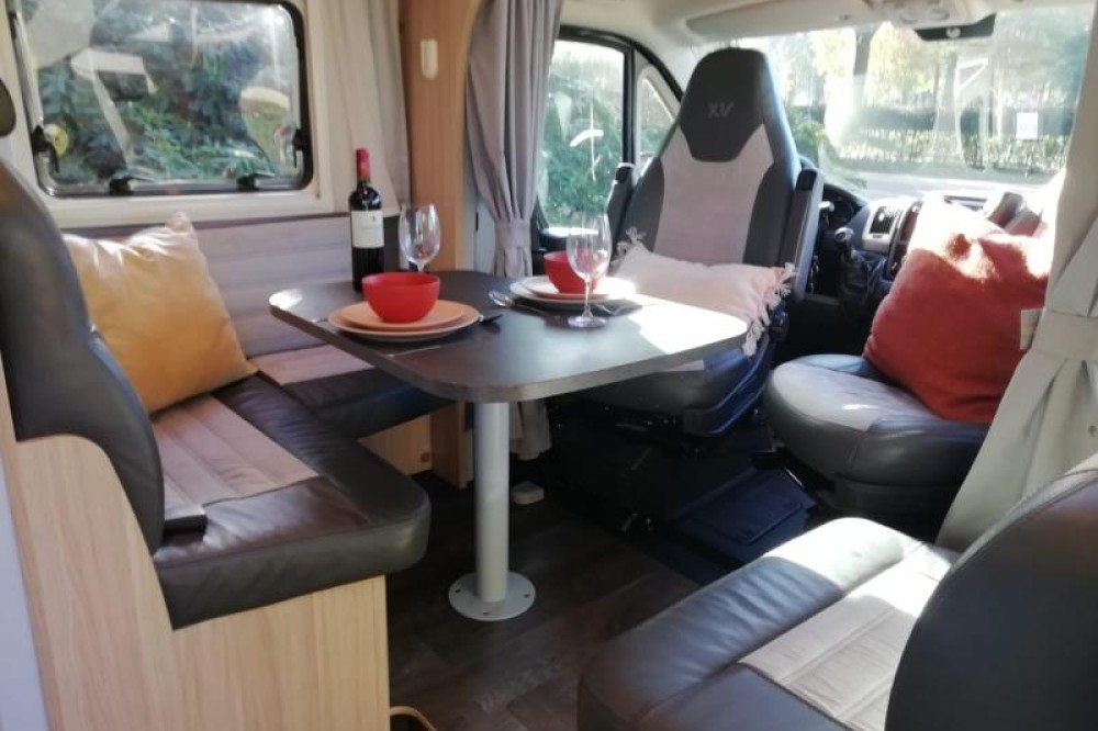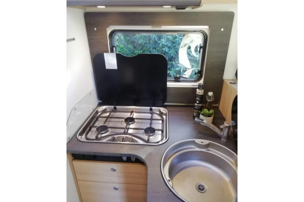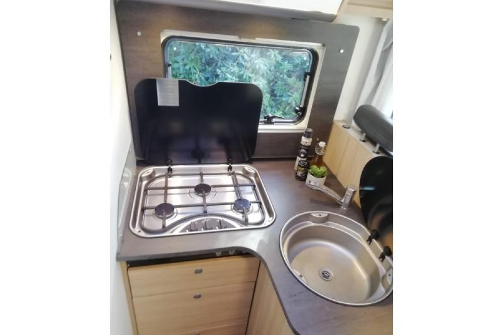 De gezellige en handige rondzit waar de camper over beschikt, kan ook dienen als extra slaapgelegenheid. De keuken is in het midden van de camper gemonteerd en beschikt onder meer over een 3-pits kooktoestel en gootsteen met kraan. De praktische kastjes bieden een zee aan ruimte voor uw voorraad. Voor een snelle toevoer van warm water is er een boiler aanwezig. De inbouwkoelkast met vriescompartiment heeft een grote XXL inhoud.