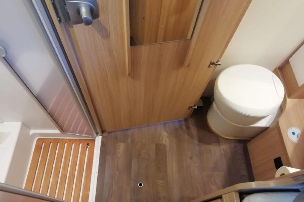 In de badkamer kunt u zich heerlijk opfrissen bij de wastafel. Verder is er ook een cassettetoilet ingebouwd. In de camper kunt u ook douchen. Er bevindt zich een doucheruimte naast het slaapgedeelte.