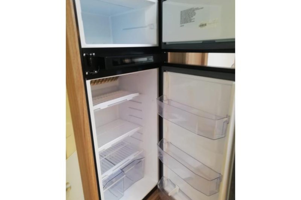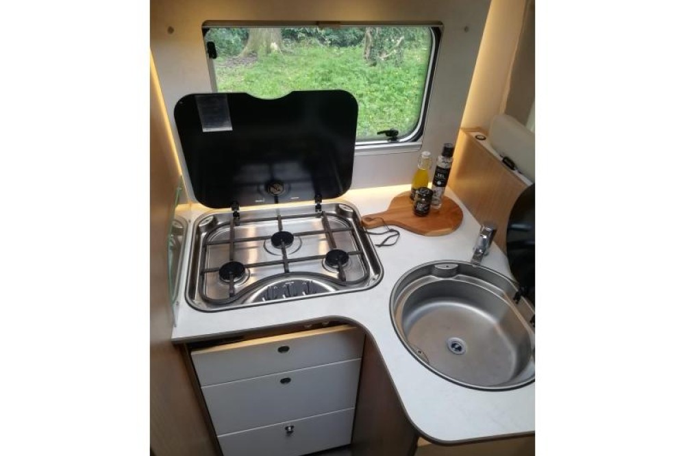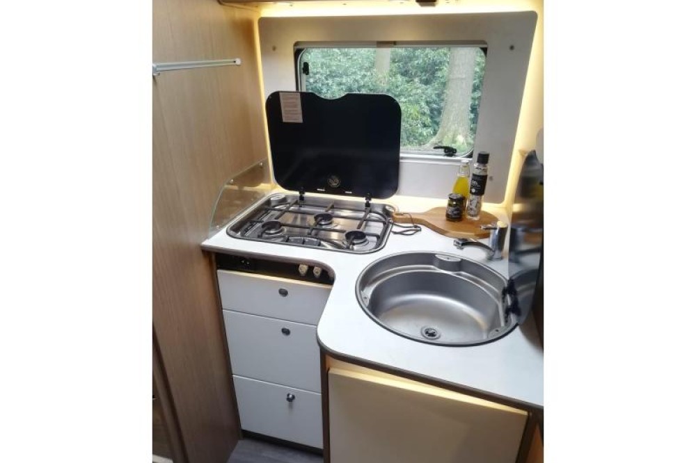 Het keukenblok is centraal in de camper gemonteerd en is onder anderen uitgerust met 3-pits gascomfoor, spoelbak en kraan. Er is een warmwatervoorziening in de vorm van een boiler aanwezig. De XXL koelkast met vriesvak biedt voldoende ruimte voor heel uw voorraad.