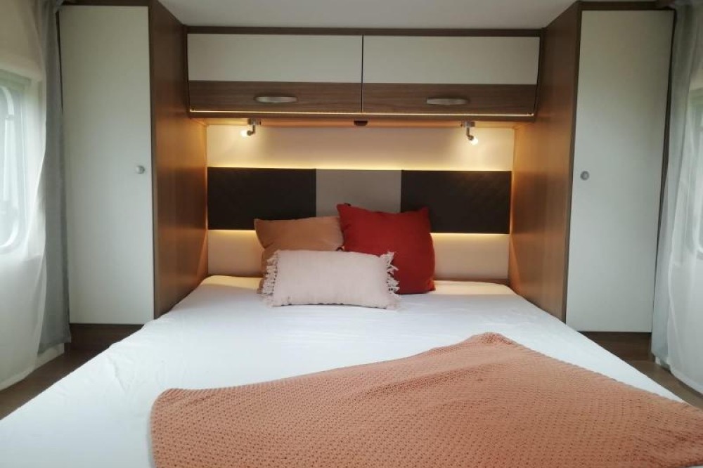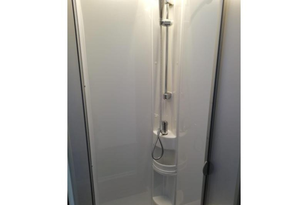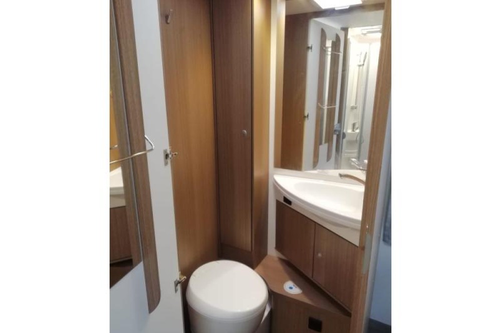 Er wordt veel ruimte bespaard door het gebruik van het tweepersoons hefbed boven de zitgroep. Dit hefbed heeft een lengte van 195 cm en is 140 cm breed. Het ruime queensbed heeft voor een gemakkelijke instap. Dit bed heeft een lengte van 195 cm en is 150 cm breed. De 5e slaapplaats is te creeeren bij de zitgroep. Dit 5e bed heeft een lengte van 110 cm en is 100 cm breed. Hierdoor is deze camper uitermate geschikt voor een gezin van 5 personen. Behalve een cassettetoilet heeft de badkamer ook een wastafel, waar u zich heerlijk op kunt frissen. Naast het slaapgedeelte bevindt zich ook de douchegelegenheid.