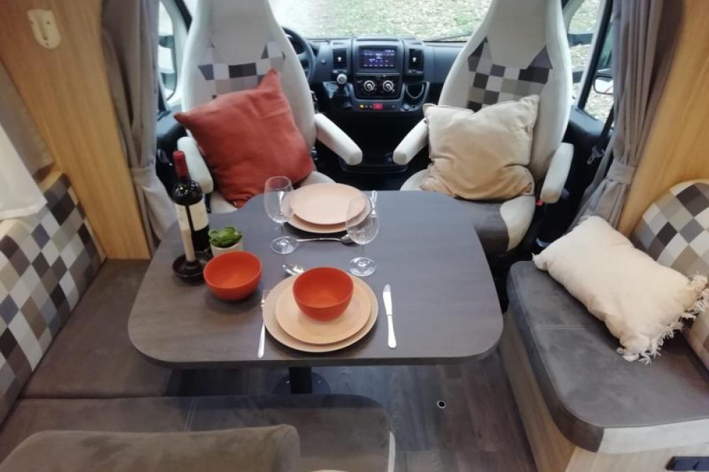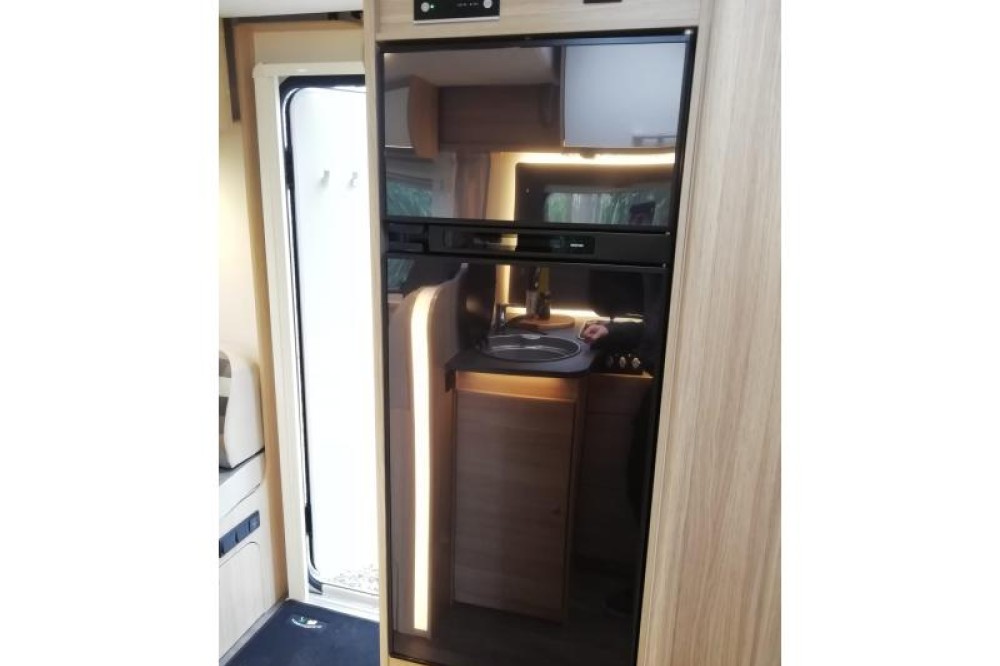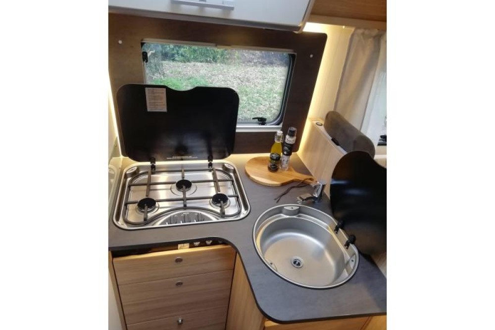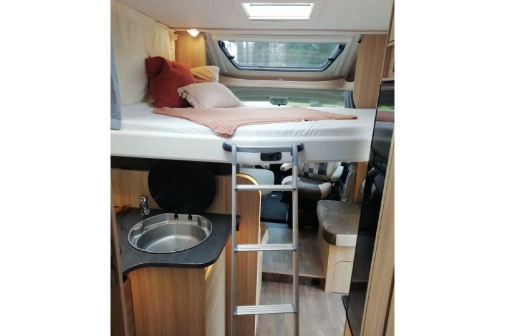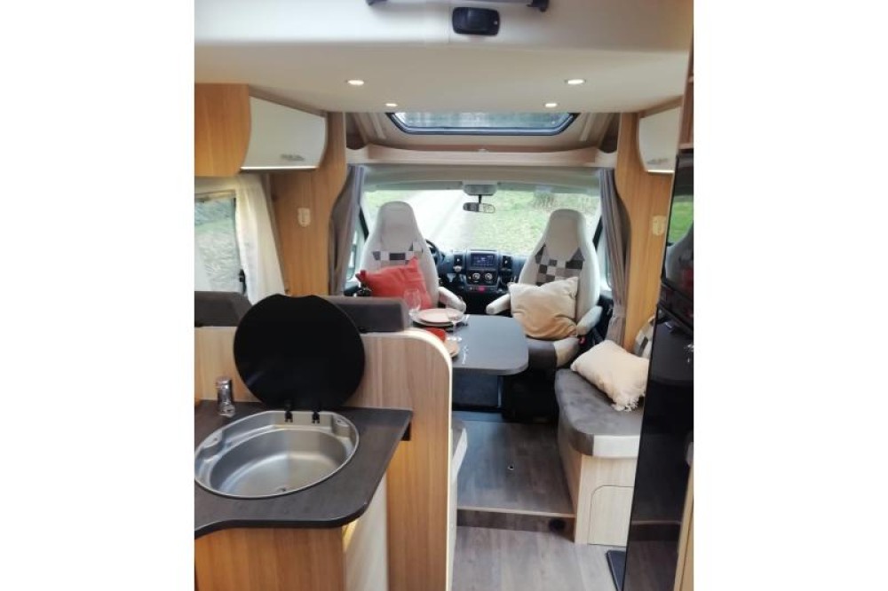 De ruime rondzit, waar deze camper over beschikt, kan ook als extra slaapgelegenheid worden gebruikt. Het keukenblok is centraal in de camper gemonteerd en is onder anderen uitgerust met 3-pits gascomfoor, spoelbak en kraan. Er is een boiler aanwezig, die u van warm water voorziet. De ingebouwde XXL koelkast met vriesvak is uitgevoerd in een ruime uitvoering.