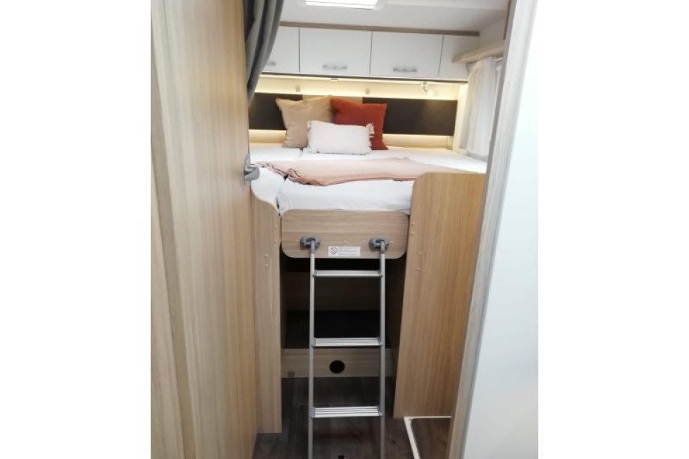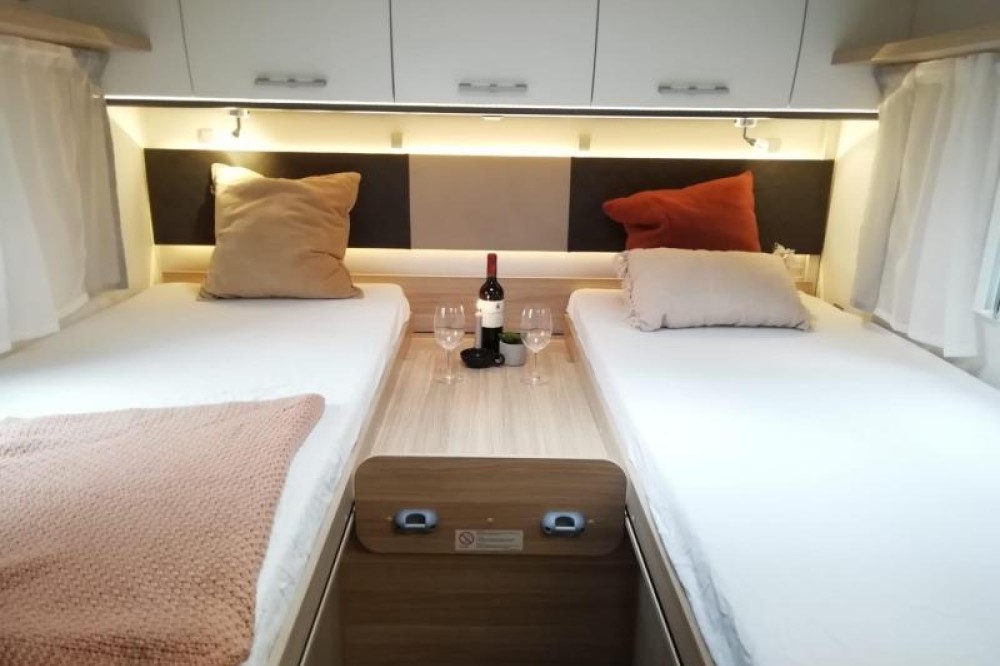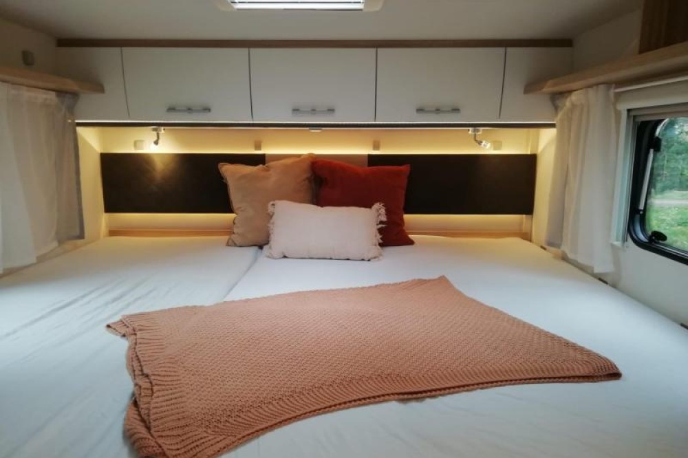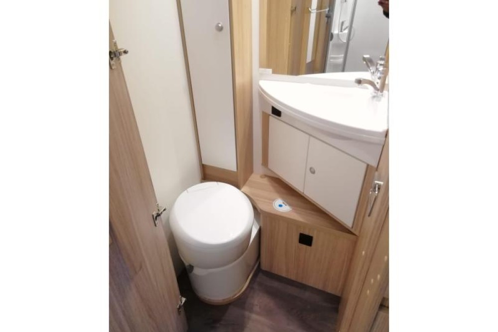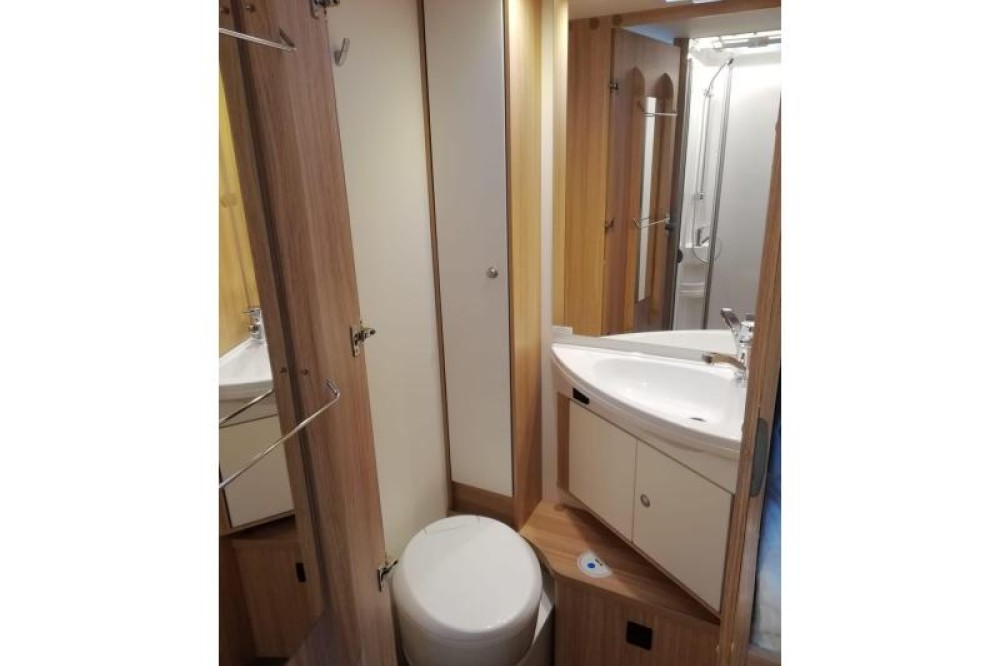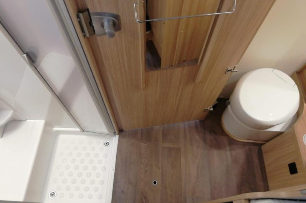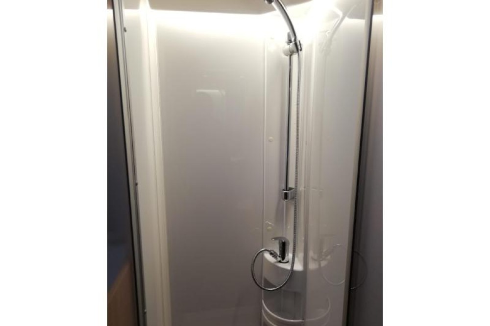 Er wordt veel ruimte bespaard door het gebruik van het tweepersoons hefbed boven de zitgroep. Dit bed heeft een lengte van 200 cm en is 140 cm breed. Slapen doet u op de 2 aparte bedden, die borg staan voor extra ruimte en een gemakkelijke instap. Deze bedden hebben een lengte van 200 / 190 cm en zijn beide 83 cm breed. Deze bedden kunnen zelfs als één groot bed gemaakt worden. Dan heeft dit bed een lengte van 200 cm en is 200 cm breed. Aan slaapcomfort zal het u in deze camper, die is voorzien van lattenbodems en traagschuimmatrassen, zeker niet ontbreken. In de badkamer vindt u een wastafel om u op te frissen, alsmede een ingebouwd cassettetoilet. Er is bovendien een doucheruimte in de camper, zodat u van uw eigen douche gebruik kunt maken.
