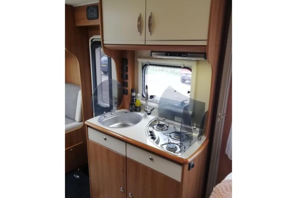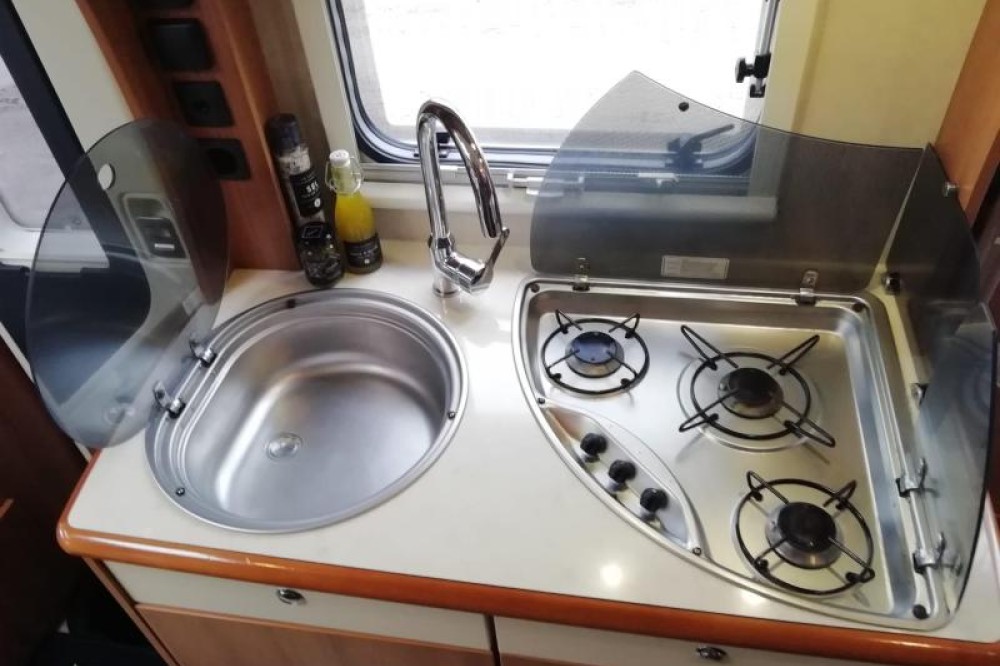 De riante rondzit is ideaal om aan het einde van de rit gezellig te eten en te drinken. De middenkeuken, waar de camper over beschikt, is onder meer voorzien van een 3-pits kooktoestel, spoelbak en kraan. De diverse kastjes in de keuken zijn handig om de kleine spullen in op te bergen. Een ingebouwde boiler voorziet u van warm water. De koelkast met vriescompartiment is ruim genoeg voor al uw etenswaren.
