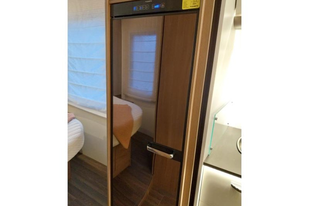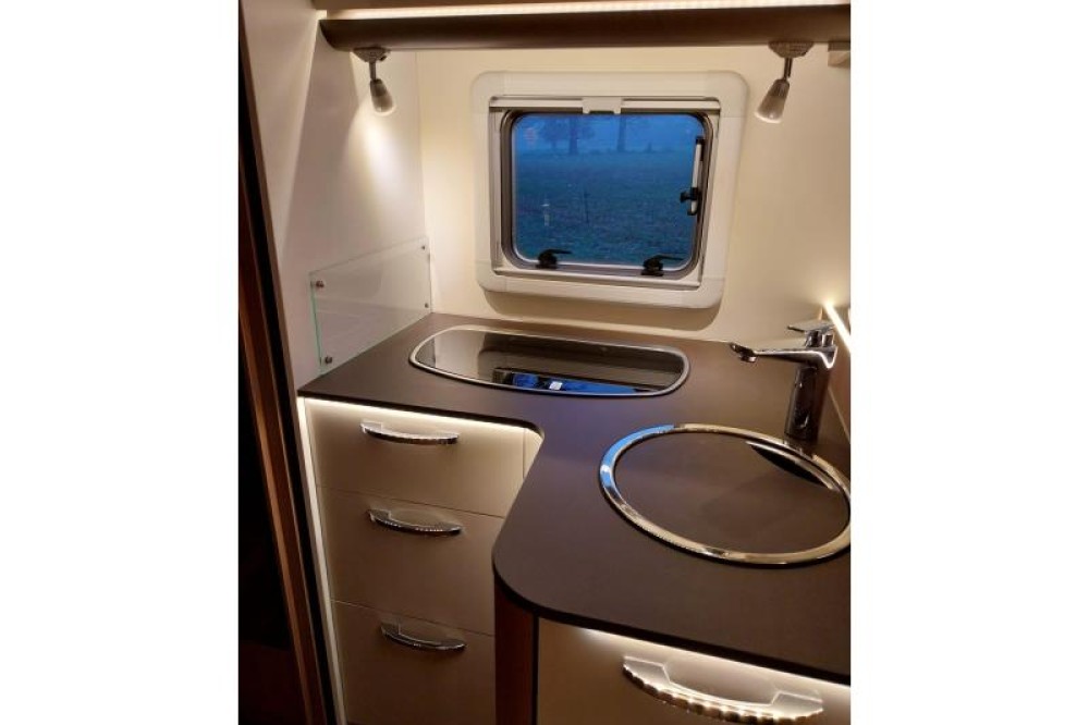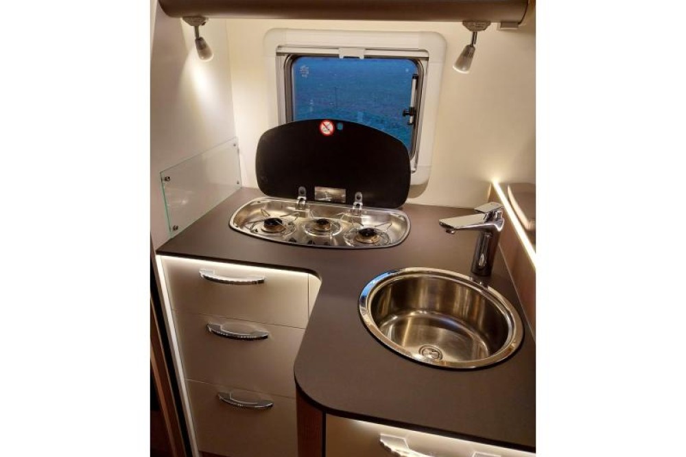 Het keukenblok is centraal in de camper gemonteerd en is onder anderen uitgerust met 3-pits gascomfoor, spoelbak en kraan. Er is een warmwatervoorziening in de vorm van een boiler aanwezig. De XXL inbouwkoelkast met vriescompartiment heeft een grote inhoud.