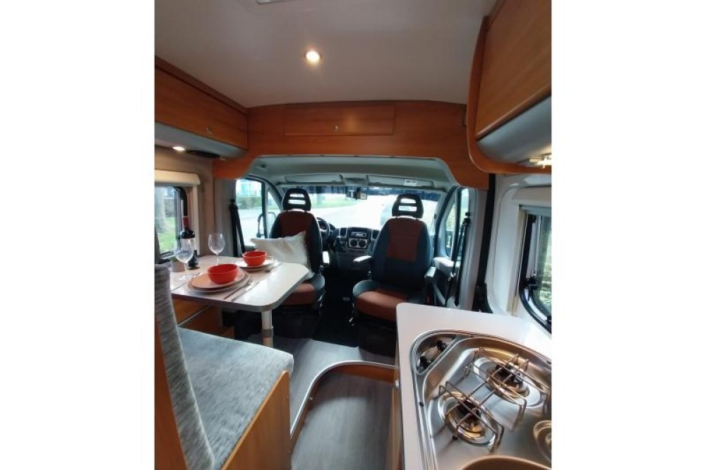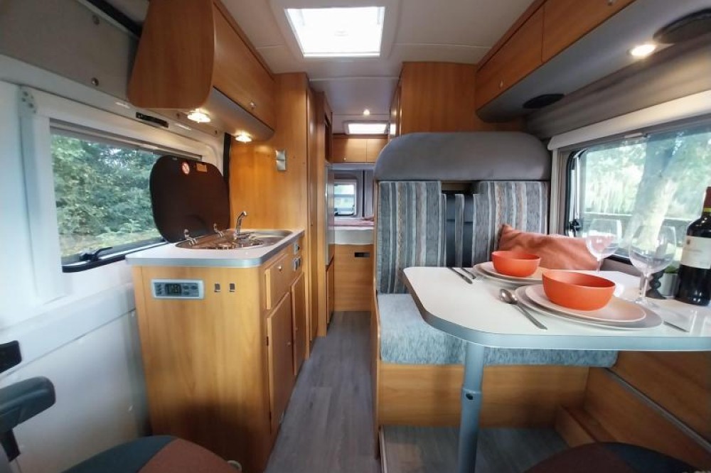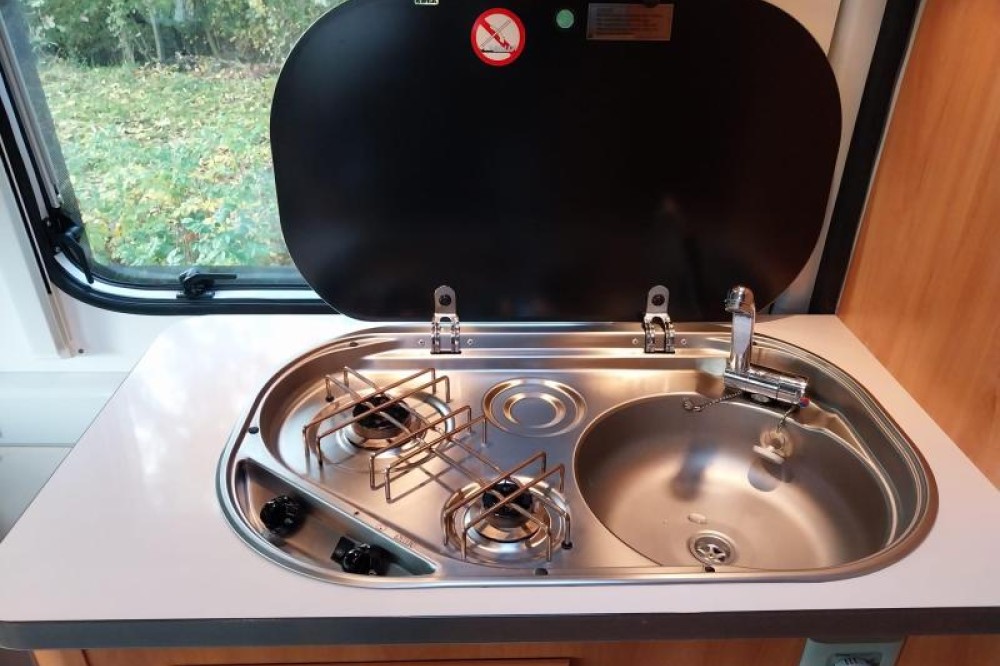 In de ruime treinzit vindt u een gezellige plek om te zitten, deze kan uiteraard ook dienen als extra slaapplaats. Ideaal voor uw (klein) kind. Dit bed heeft een lengte van 110 cm en is 90 cm breed. De middenkeuken, waar de camper over beschikt, is onder meer voorzien van een 2-pits kooktoestel, spoelbak en kraan. Er is een warmwatervoorziening in de vorm van een boiler aanwezig. De koelkast, voorzien van een vriesvak, is een lademodel. Hierdoor kunt u makkelijk bij uw etenswaren komen.