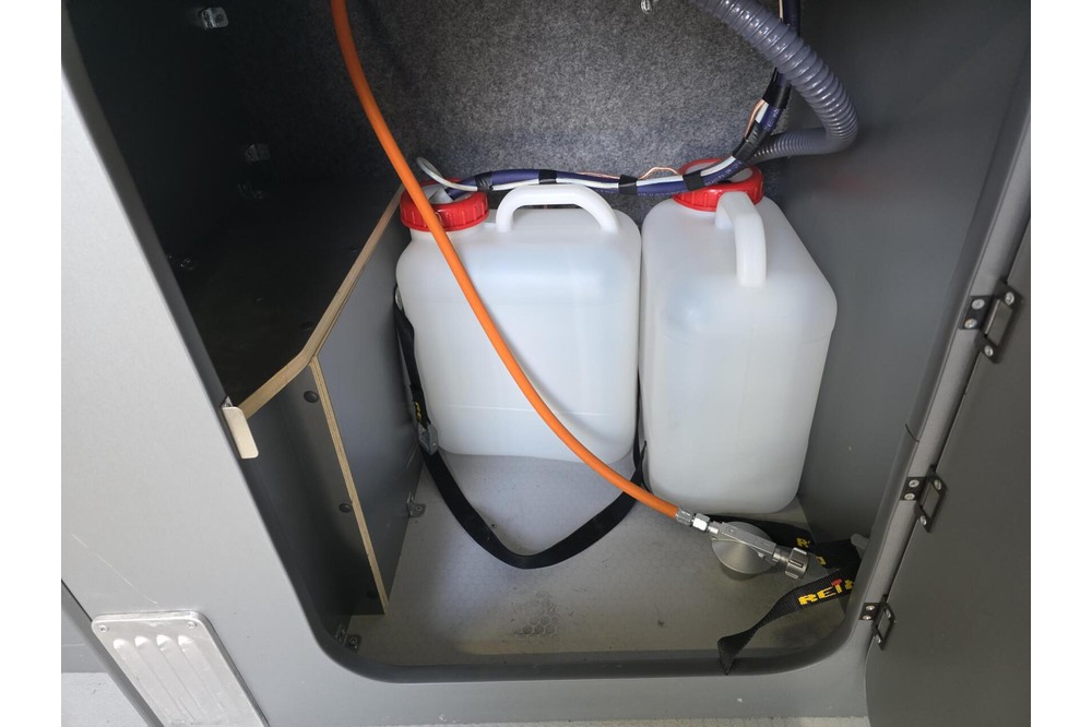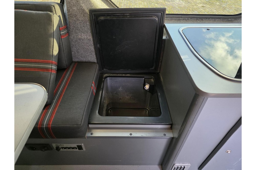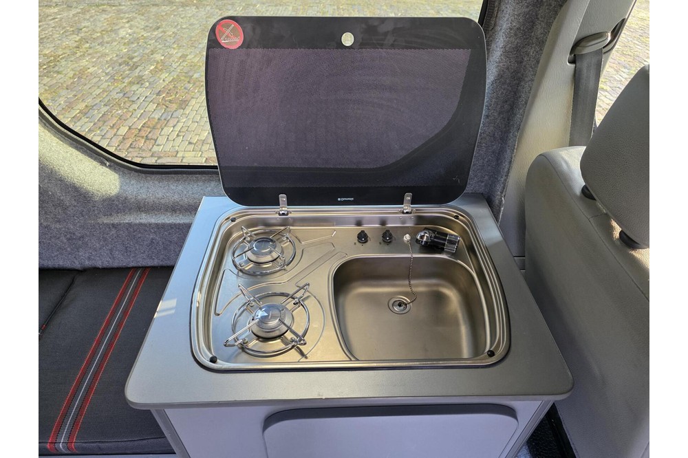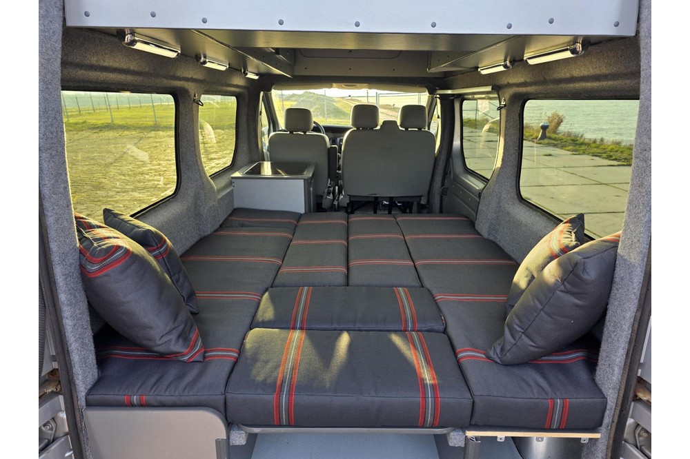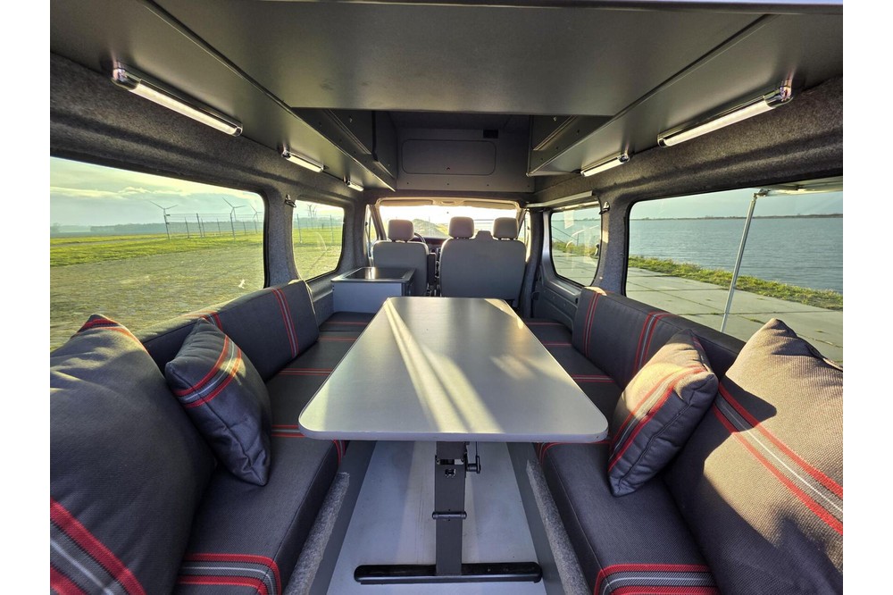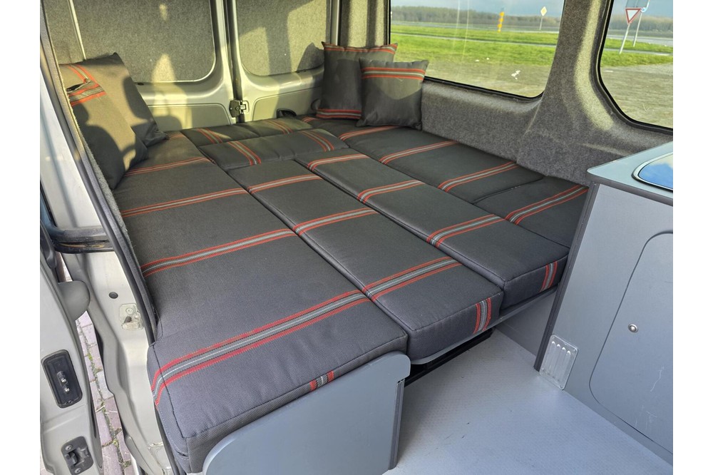 De camper is uitgerust met een volledig nieuwe, ongebruikte camperinrichting. Alles wat je nodig hebt voor een heerlijk avontuur is aanwezig: een bank met ingebouwde koelkast, een kookstel met kraan, veel opbergruimte in de bovenkasten en een nieuwe Fiamma luifel voor ontspannen momenten buiten. Hoewel de inrichting nooit is gebruikt om te kamperen, zijn er door vervoer van spullen enkele krasjes ontstaan op de houten delen en ontbreekt het plankje van de rechterbank achterin.