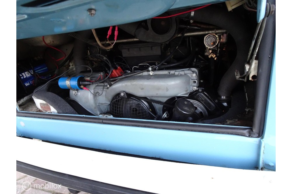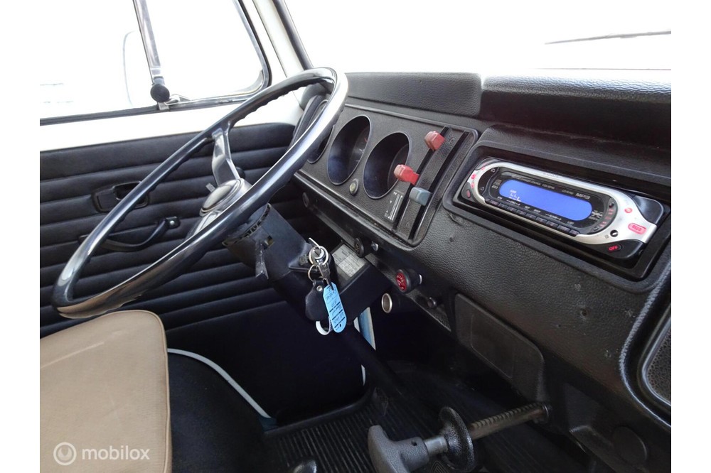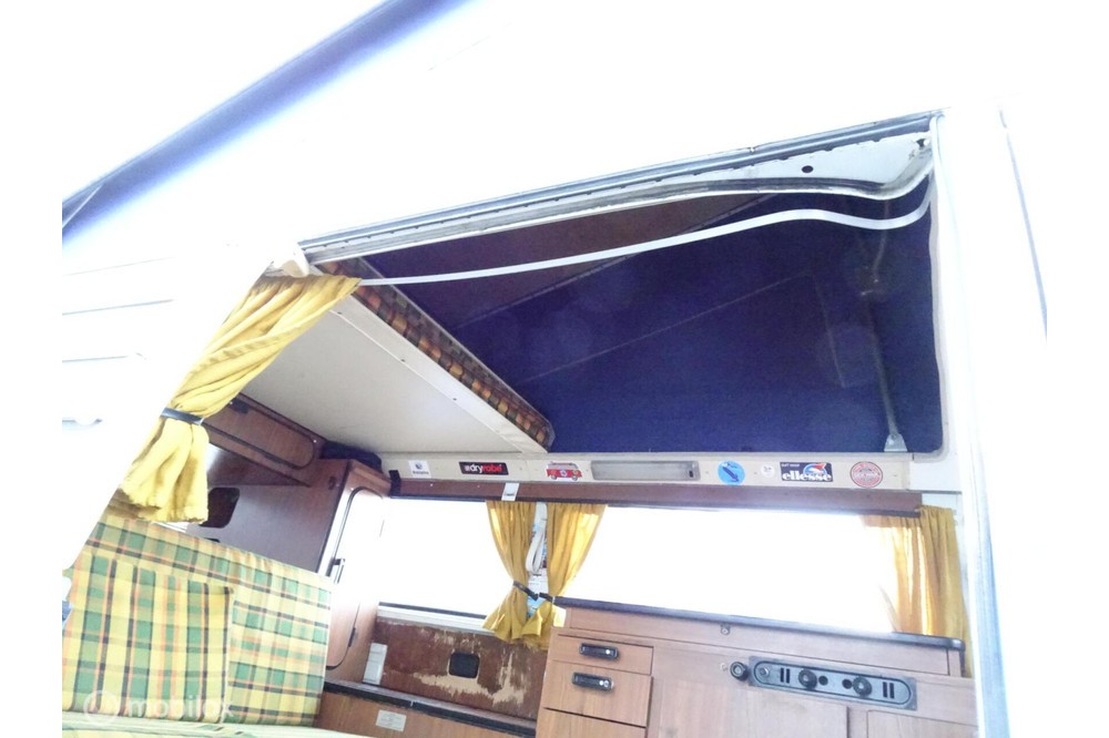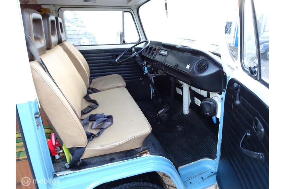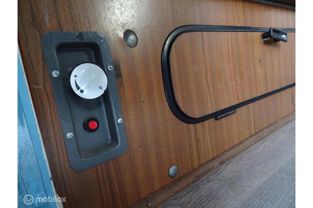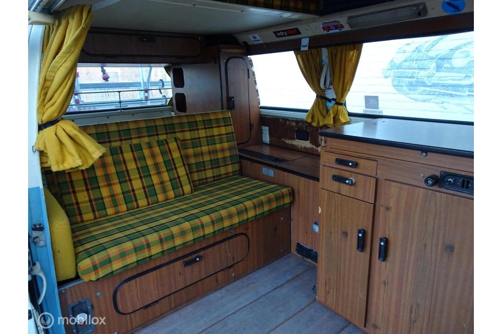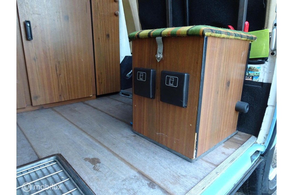 Het kampeer deel is erg fraai en erg origineel. Naast de diverse opberg mogelijkheden en de tot twee persoonsbed om te toveren achterbank is het dak uiteraard uitstelbaar en voorzien van een nieuw doek, in de bijpassende kleur donkerblauw. Op de vloer ligt een watervaste vloer en onder het kook gedeelte staat een gasfles met geventileerde afvoer. Zoals het hoort! Tevens is deze T2 Westfalia Camper voorzien van een trekhaak en fietsendrager, welke uiteraard helemaal kan worden ingeklapt!