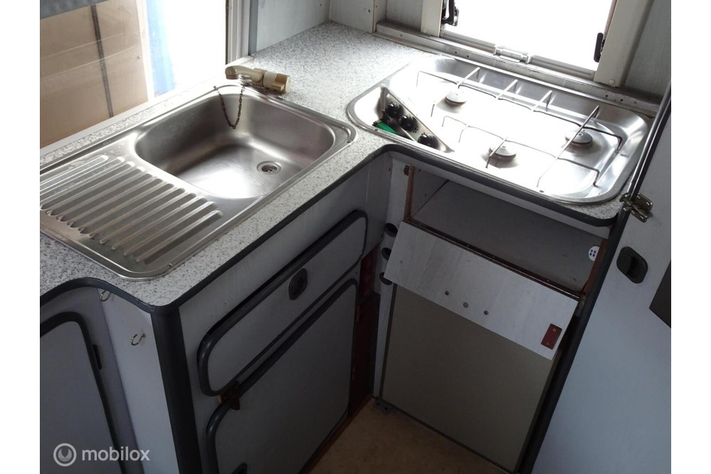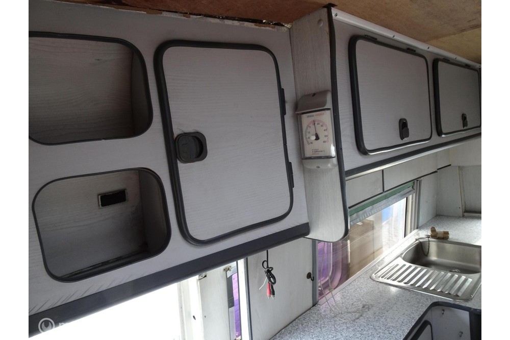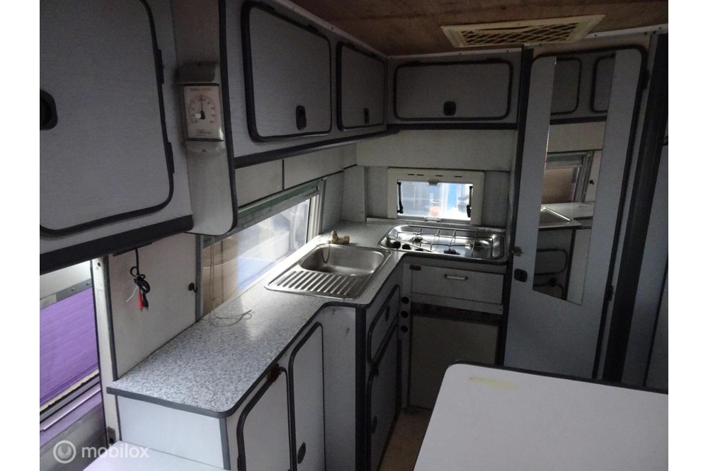 Het kampeerdeel heeft een ruime 4-persoons dinette, ruime keuken en veel opbergkasten. De natte cel is nog niet in gebruik, maar die is eenvoudig in te richten als douche of toilet ruimte.