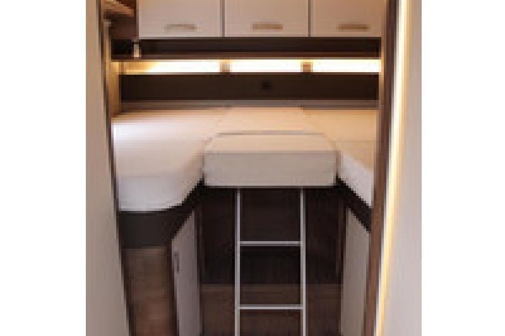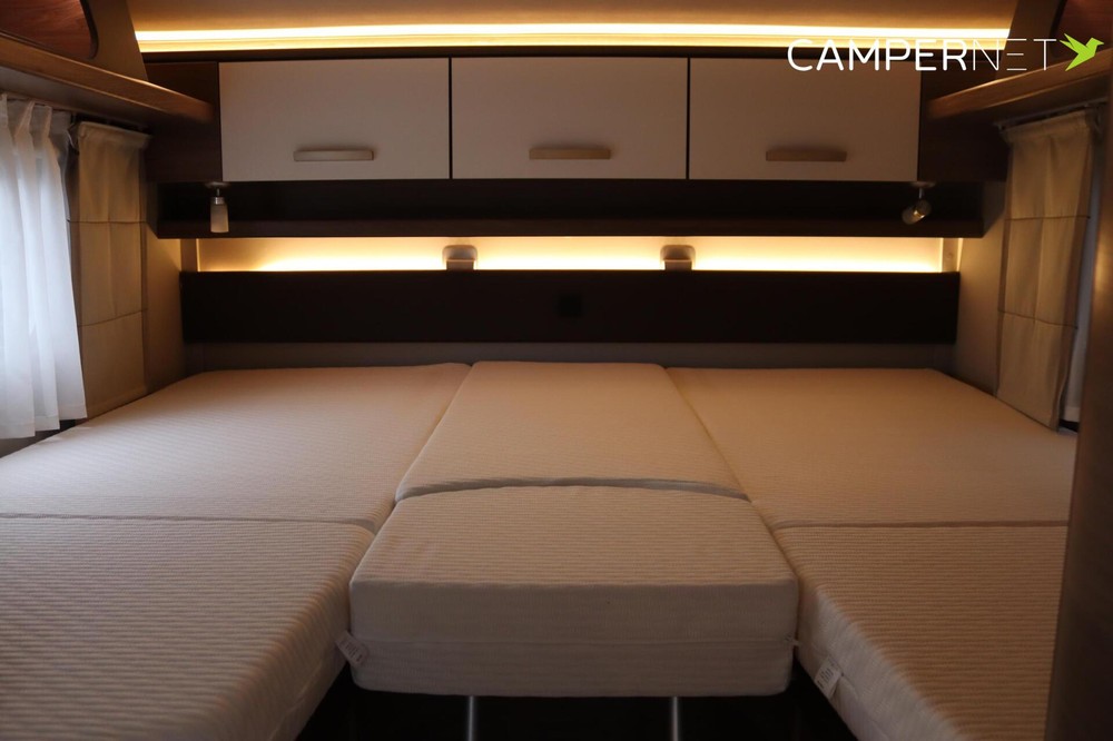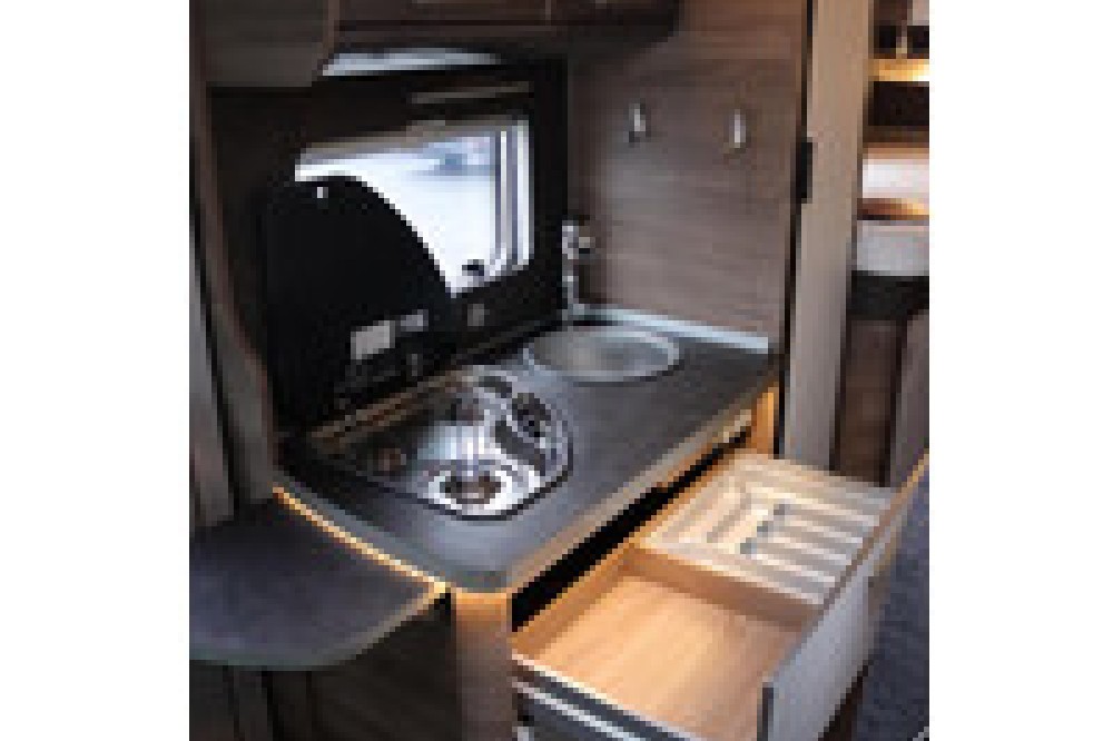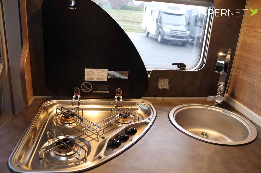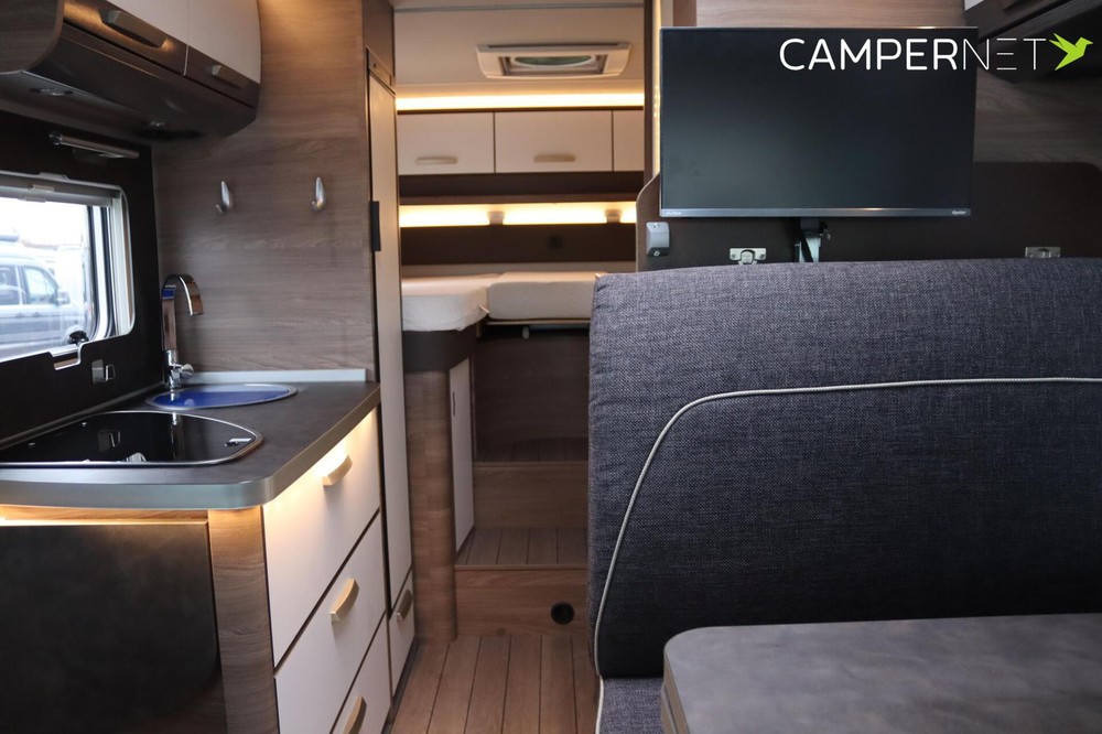 De indeling is praktisch en populair: achterin twee lage lengtebedden die eenvoudig zijn om te bouwen tot een groot tweepersoonsbed, plus een ruim hefbed voorin. De keuken is compleet uitgerust met een 3-pits kooktoestel, veel bergruimte en een grote 180 liter koelkast met aparte vriezer.
