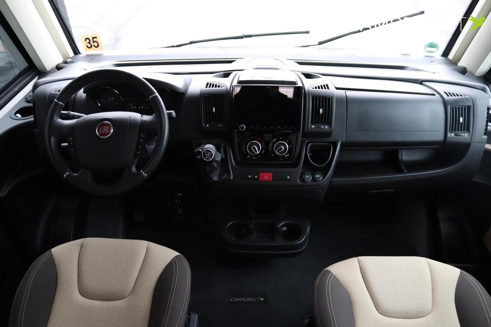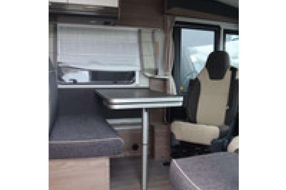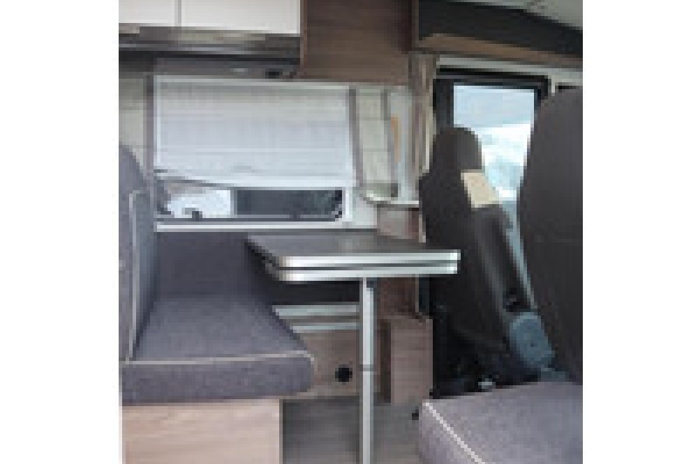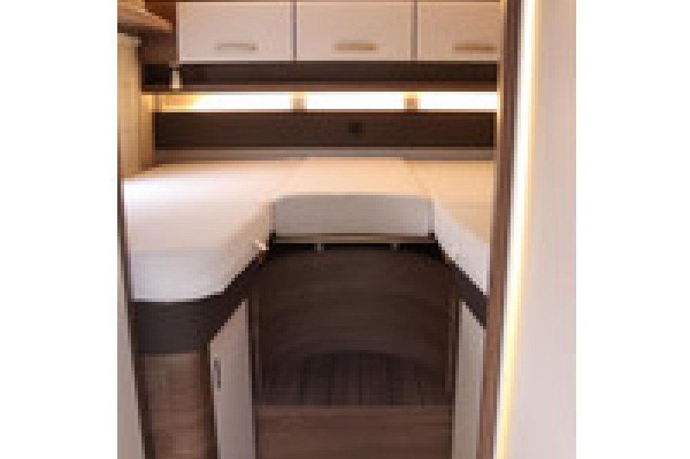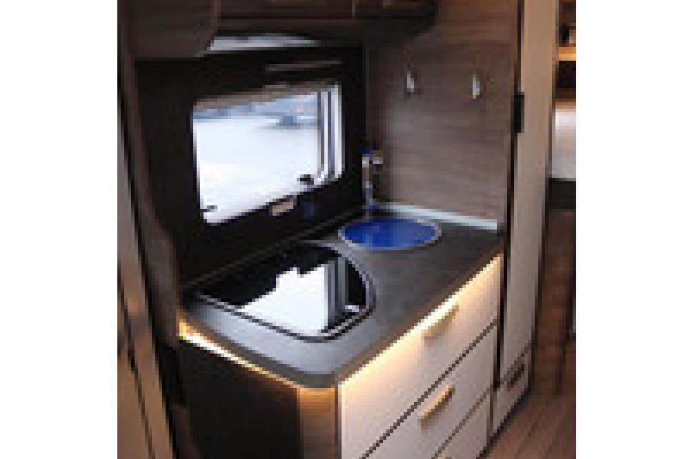 De indeling is praktisch en populair: achterin twee lage lengtebedden die eenvoudig zijn om te bouwen tot een groot tweepersoonsbed, plus een ruim hefbed voorin. De keuken is compleet uitgerust met een 3-pits kooktoestel, veel bergruimte en een grote 180 liter koelkast met aparte vriezer.