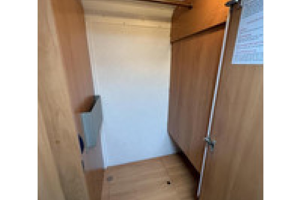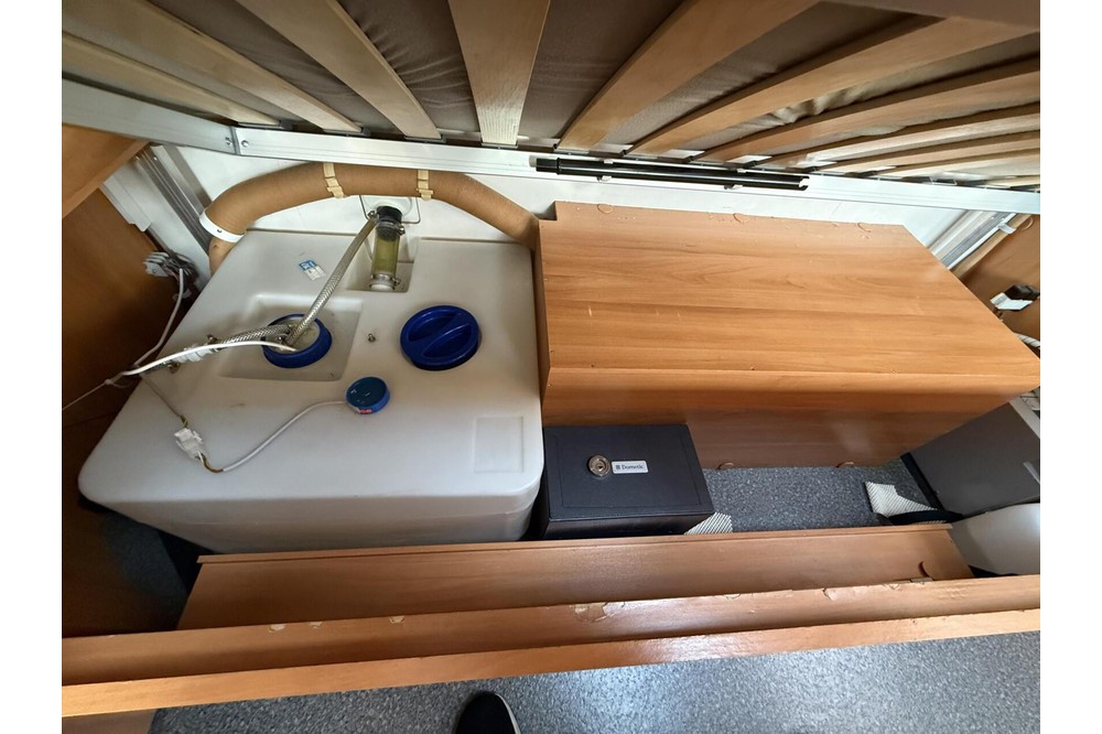 Grote eenpersoonsbedden met opbergruimte eronder leiden naar de grote eindwasruimte met een aparte douchecabine, toilet, wastafel en meer opbergruimte.