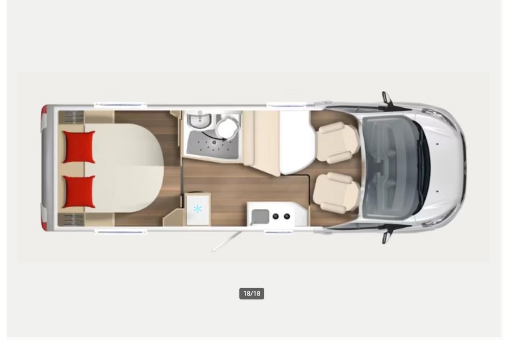 Aan de voorzijde met 2 draaistoelen, waardoor er veel leefruimte wordt gecreëerd. Je geniet van een ruime loopruimte die je naar de badkamer brengt. Achterin de camper tref je een Queensbed die in hoogte verstelbaar is. De slaapkamer is afsluitbaar van het woongedeelte waardoor er volledige rust kan worden gecreëerd.