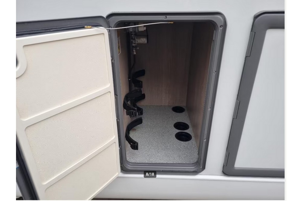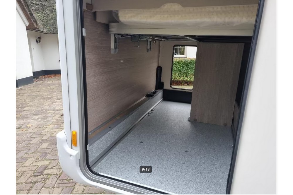 Deze camper beschikt over een grote garage die variabel in te delen is door het bed te stellen op hoogte. Zo passen er minstens 2 fietsen in en vele andere spullen.