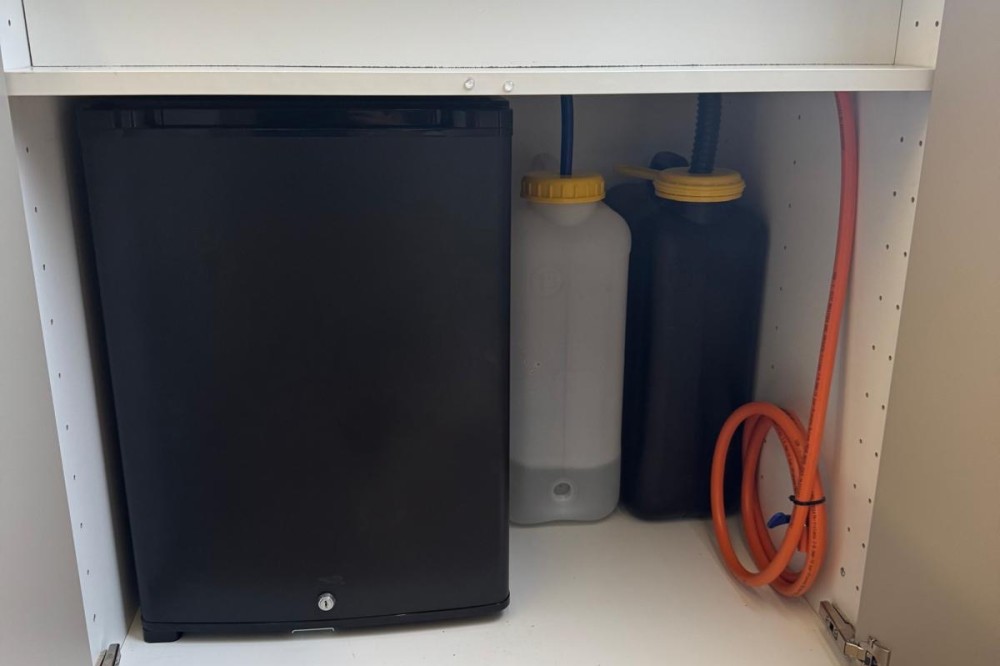 • Keuken met kookgelegenheid, spoelbak en opbergruimte