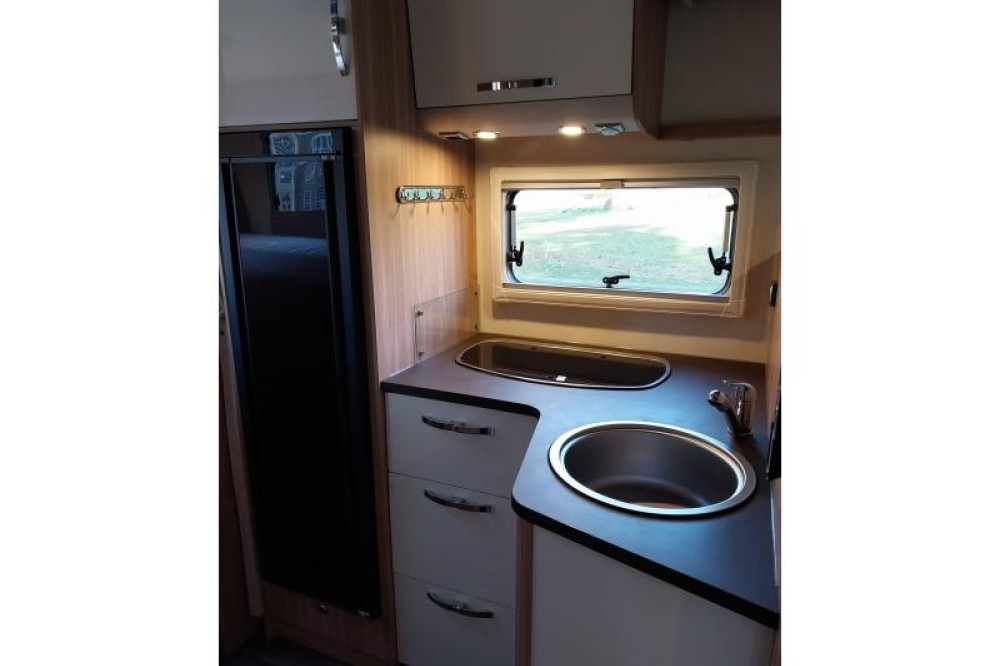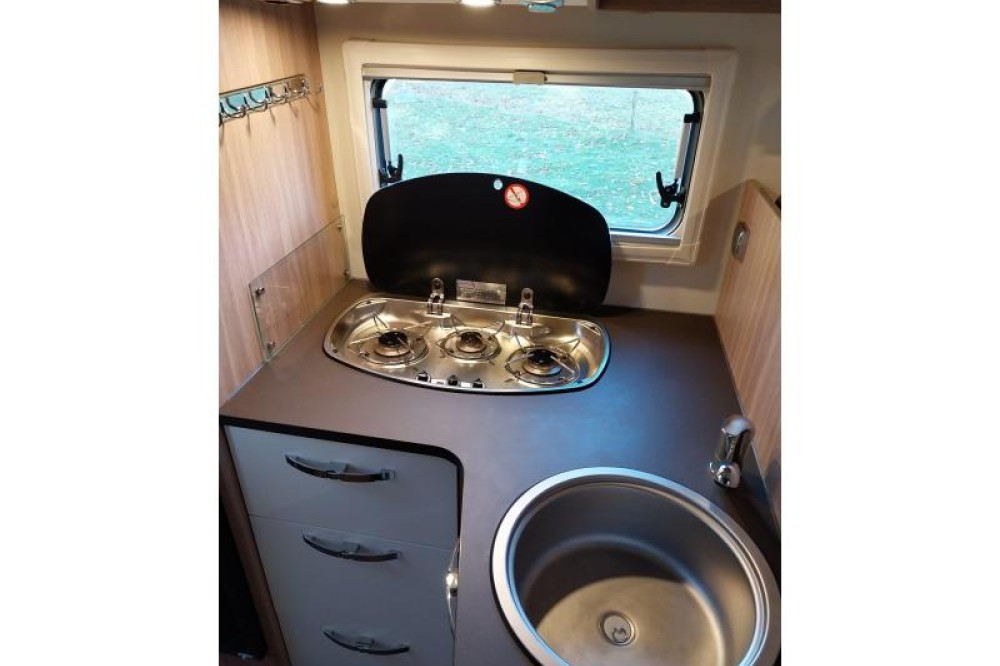 Centraal in de camper bevindt zich de middenkeuken, uitgerust met een spoelbak, kraan en 3-pits kooktoestel. Er is een warmwatervoorziening in de vorm van een boiler aanwezig. De XXL koelkast met vriesvak biedt voldoende ruimte voor heel uw voorraad.