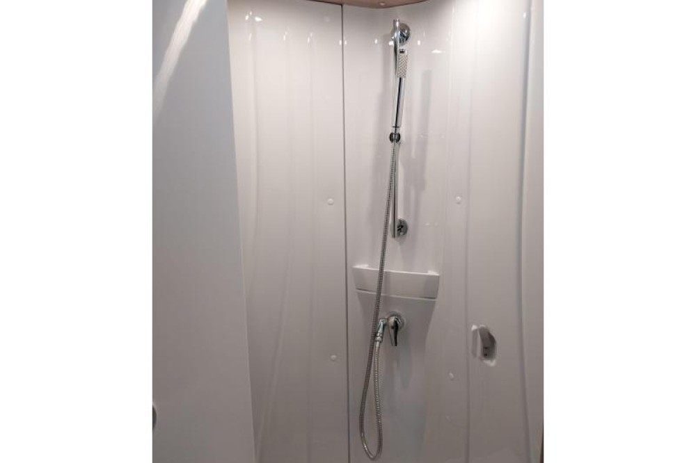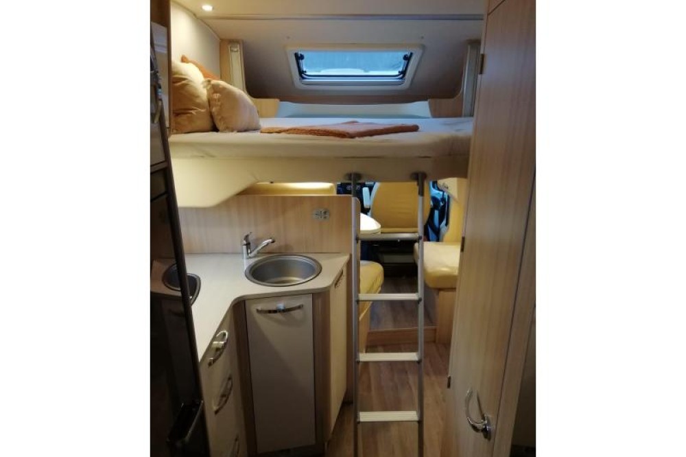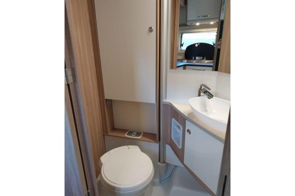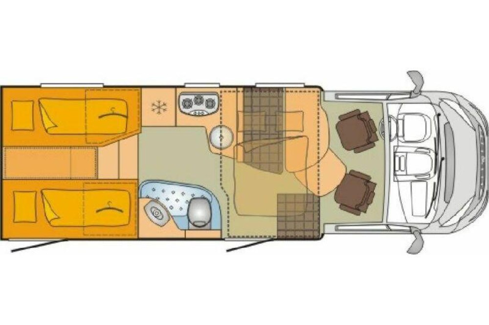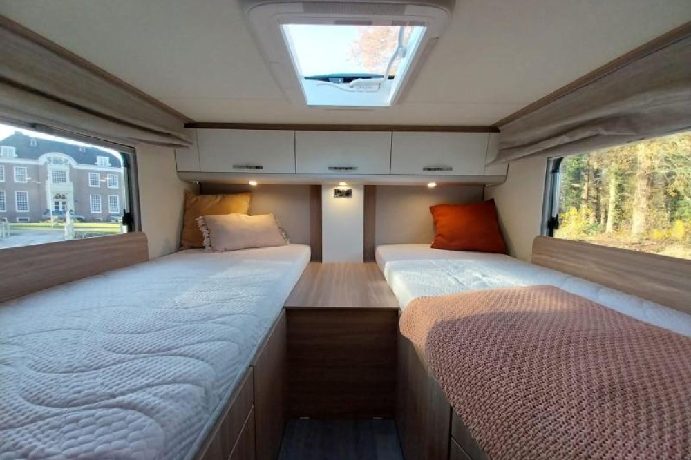 Er wordt veel ruimte bespaard door het gebruik van het tweepersoons hefbed boven de zitgroep. Dit hefbed heeft een lengte van 200 cm en is 140 cm breed. De twee aparte bedden achterin de camper bieden een gemakkelijke instap. Deze bedden hebben beide een lengte van 200 cm en zijn beide 80 cm breed. U kunt zich heerlijk opfrissen bij de wastafel in de badkamer. Daar is ook een cassettetoilet ingebouwd. Ook is de camper uitgerust met een douchegelegenheid, zodat u zich ook onderweg heerlijk kunt opfrissen.