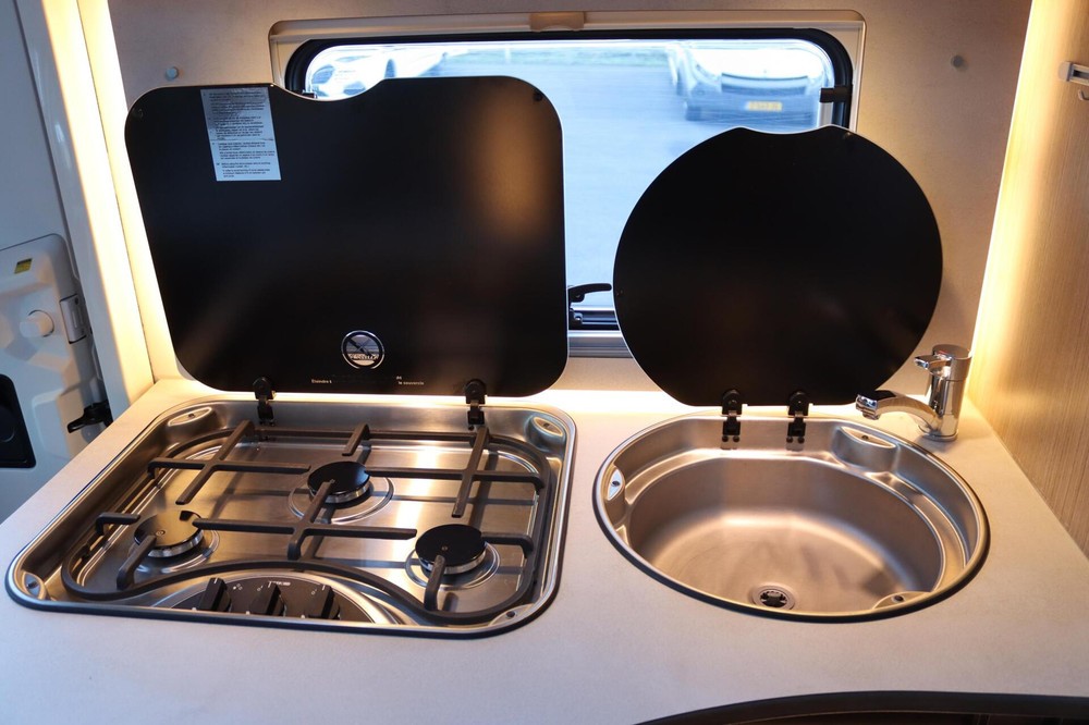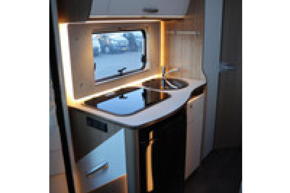zijkeuken in de T135 is uitgerust met een 2-pits kookplaat met ontsteking. Al het nodige keukengerei kan worden opgeborgen in de ruime lades en bovenkastjes. De kookplaat heeft een glazen afdekplaat die als extra opbergvlak dient.