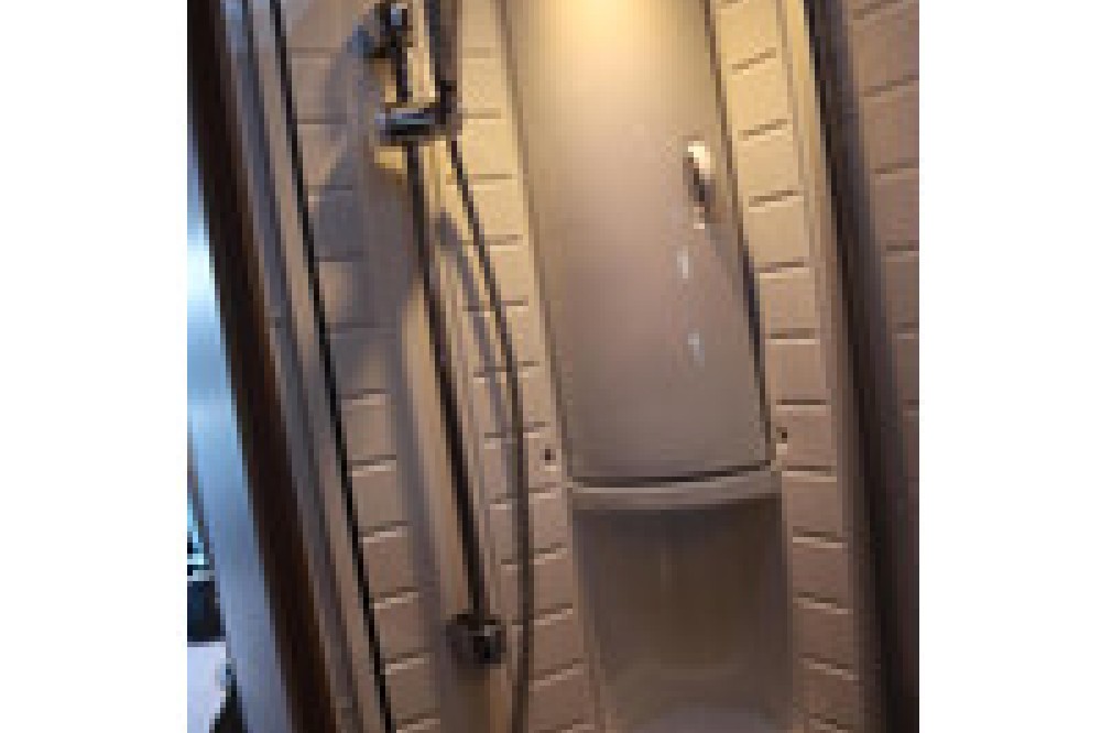 comfort badkamer achterin bevat een comfortabele wastafel en een geïntegreerde doucheruimte. Een douchewand verandert de badkamer in een handomdraai in een douche.