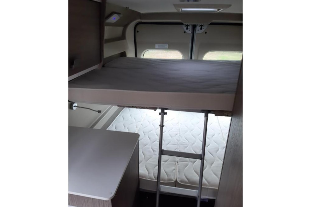 De camper is uitgevoerd met een uitneembaar stapelbed, waardoor er in totaal vier slaapplaatsen zijn. Op de foto’s krijgt u een goed beeld van de indeling en specificaties. Enkele voorzieningen op een rij: