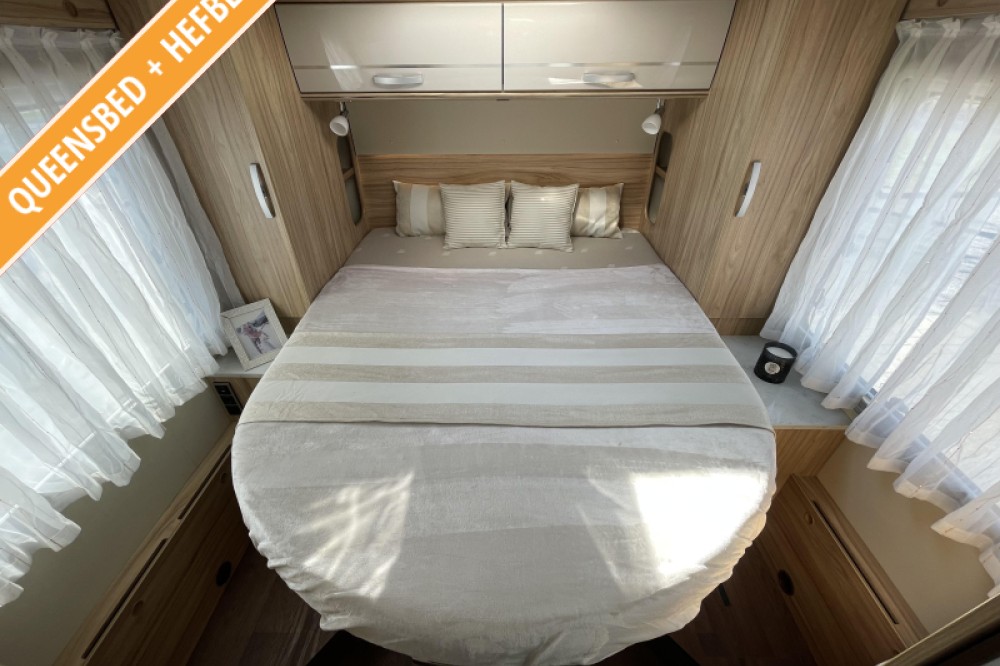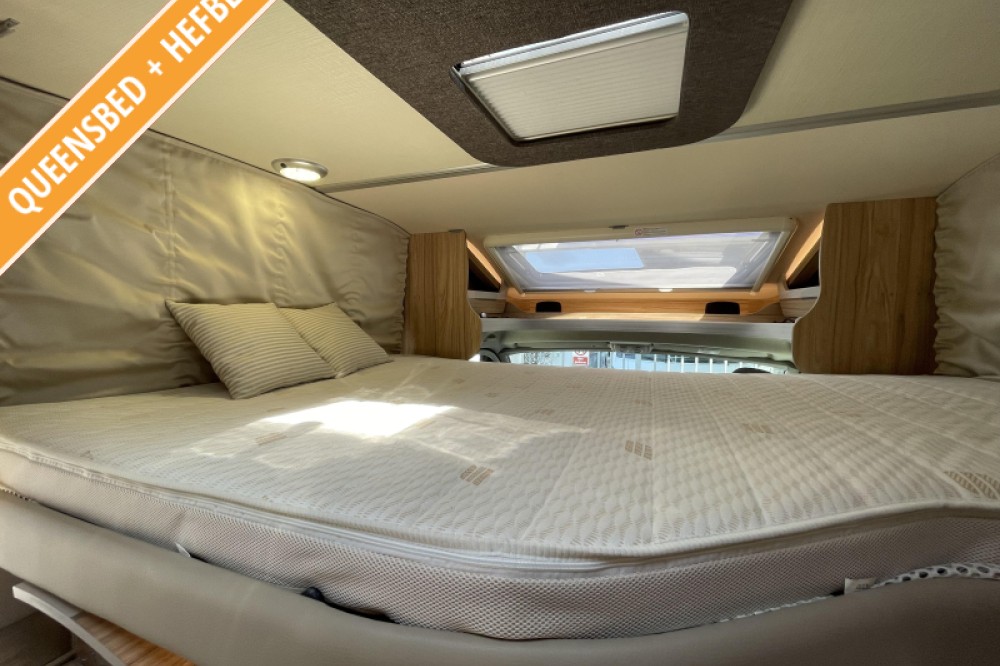 Zeer ruim 2 persoons Queensbed aan de achterzijde van de camper (eenvoudig aan beide zijden in- en uit bed stappen zonder over elkaar heen te hoeven klauteren)