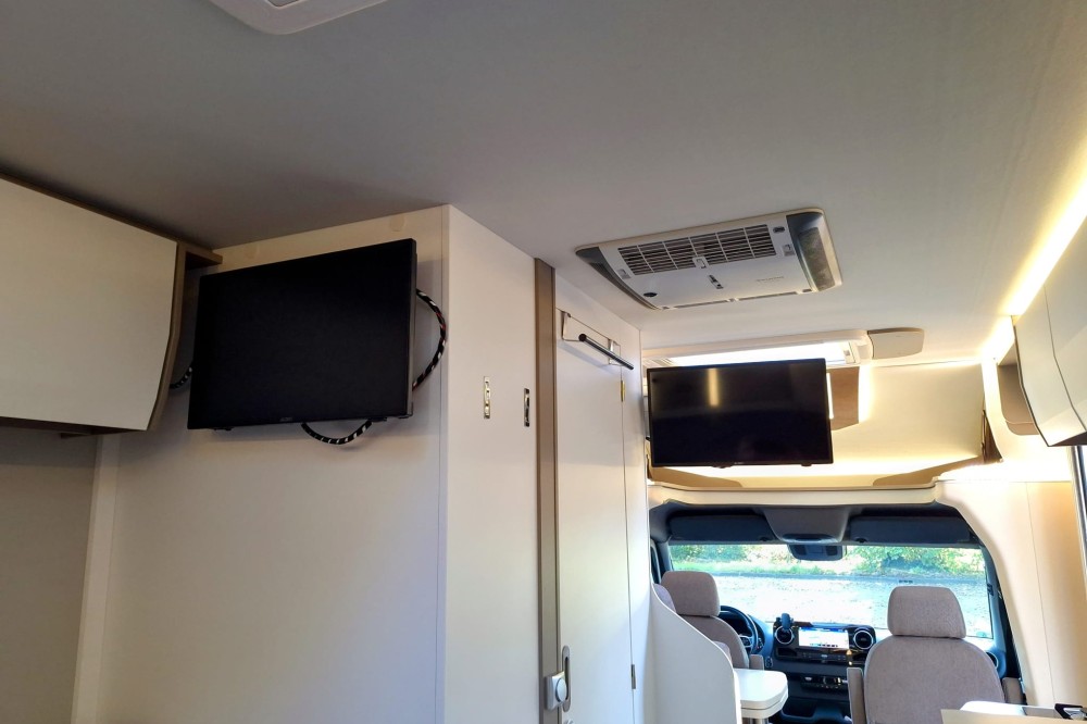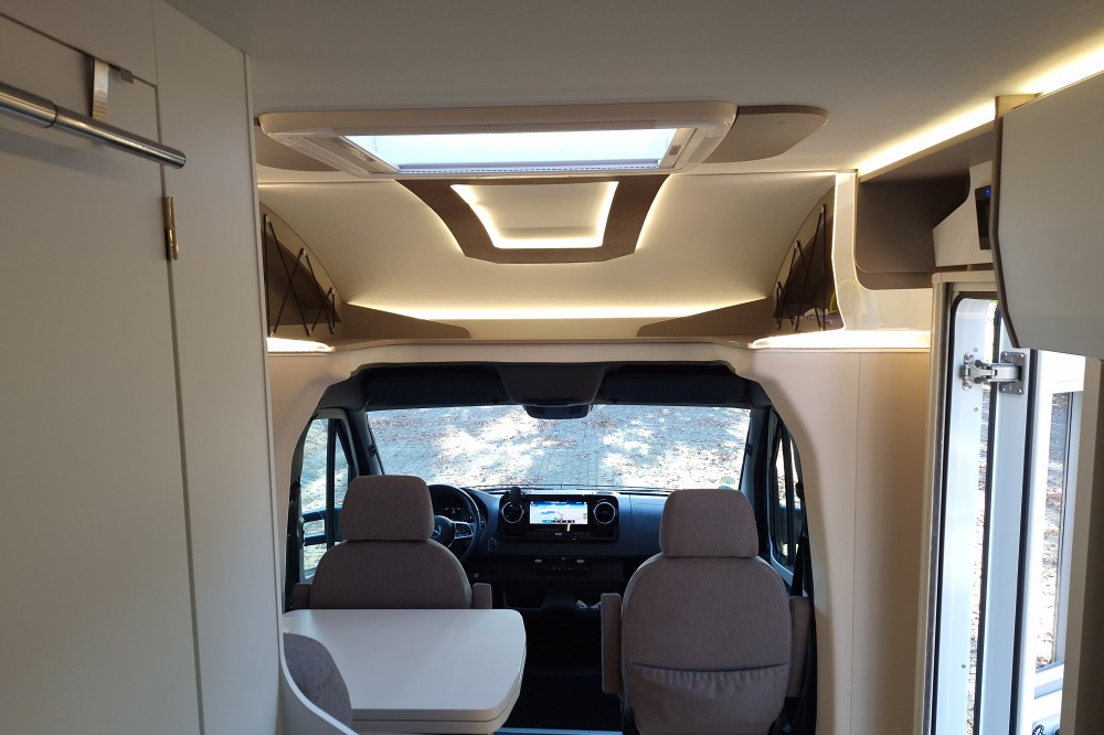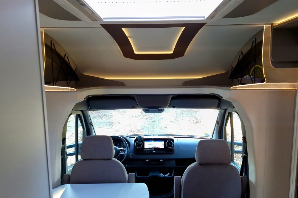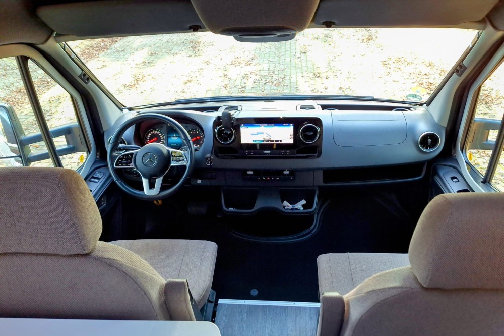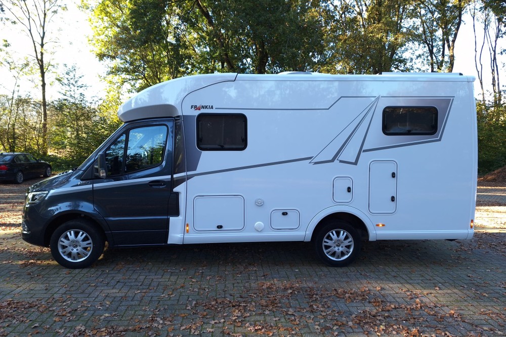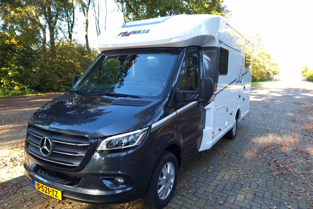 Het dashboard/ cabine beschikt over het luxe Mercedes MBUX 10,25" multimediasysteem incl. navigatie met bediening op stuurwiel, DAB, touchscreen en achterruitrijcamera. Daarnaast heeft de Frankia ook halfautomatische airco, bestuurders- en passagiersairbag, elektrisch bedienbare spiegels en ramen.