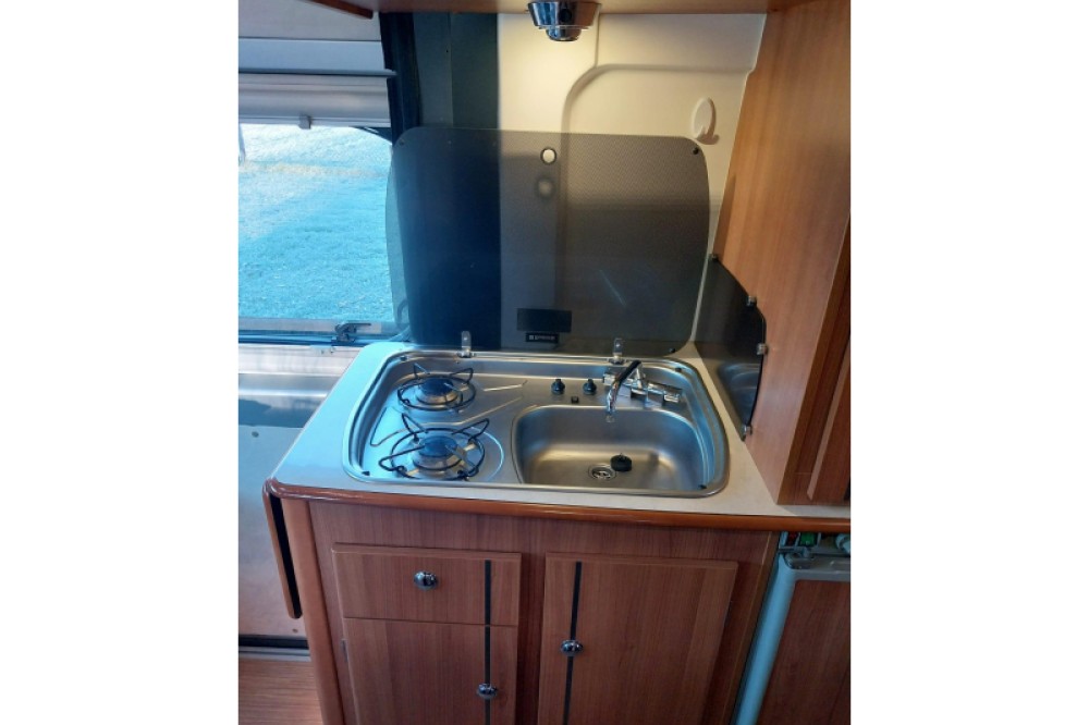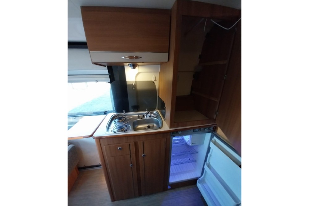 U heeft aan de treinzit niet alleen een gezellige plek om te zitten, maar het is ook een extra slaapgelegenheid. Dit is een ideaal bed voor uw (klein) kind. Dit bed heeft een lengte van 110 cm en is 100 cm breed. Het keukenblok is centraal in de camper gemonteerd en is onder anderen uitgerust met 2-pits gascomfoor, spoelbak en kraan. De boiler, die in de camper is ingebouwd, voorziet u snel van warm water. De koelkast, voorzien van een vriesvak, is een lademodel. Hierdoor kunt u makkelijk bij uw etenswaren komen.